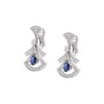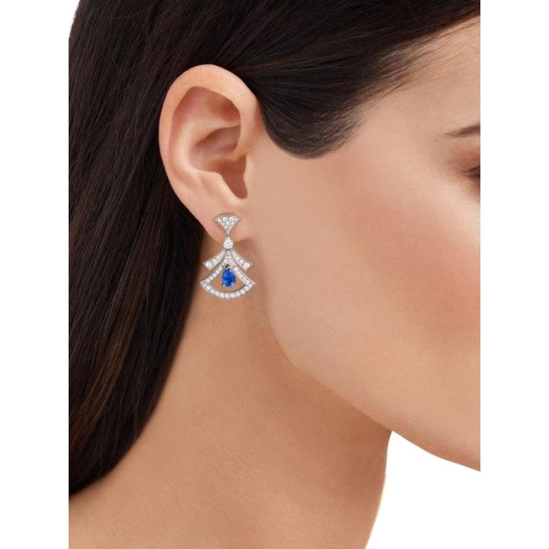 The DIVAS’DREAM earrings embody Italian elegance and charm, unleashing the power of women with a mysterious and unforgettable temperament. The delicate fan-shaped pattern full of feminine charm draws inspiration from the colorful mosaic decoration of the Baths of Caracall in Rome, highlighting the historical origins of Bvlgari and the “Eternal City” Rome with the essence of Italian elegance and charm. The exquisite and lightweight hollow design reinterprets the classic shape of the series, interpreting the charm between reality and illusion. Divas’ Dream series white 18K gold hollow earrings, inlaid with pear-shaped sapphires and round brilliant-cut diamonds, decorated with pavé diamonds.