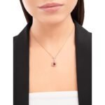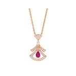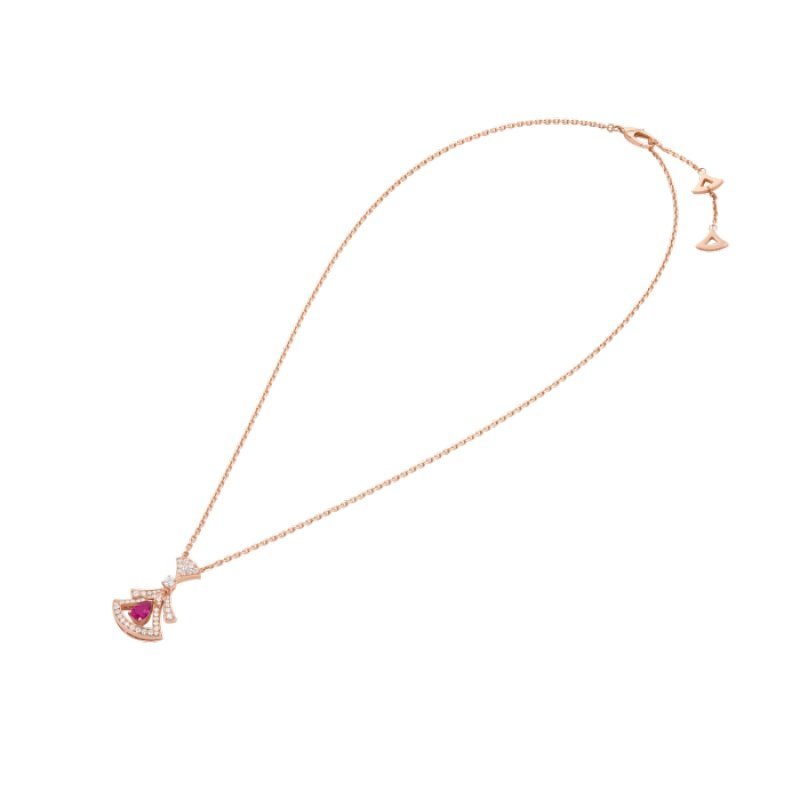 The Divas’ Dream necklace in 18K rose gold is a subtle expression of joyful femininity, with a colorful design that interprets the iconic fan pattern. The signature aesthetic of the collection is presented in a diamond-set hollow pendant, with a pear-shaped rubellite in the center adding a dynamic touch to the jewelry, reflecting Bvlgari’s Roman heritage. This piece is elegant and timeless, celebrating the beauty of nature. Divas’ Dream necklace in 18K rose gold, set with a pear-shaped rubellite and brilliant-cut diamonds.