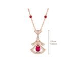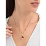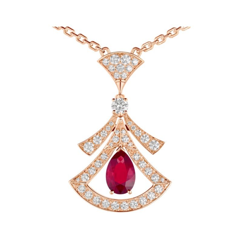 The DIVAS’DREAM necklace embodies Italian elegance and charm, unleashing the power of women with a mysterious and unforgettable temperament. The delicate fan-shaped pattern full of feminine charm draws inspiration from the colorful mosaic decoration of the Baths of Caracall in Rome, highlighting the historical origins of Bvlgari and the “Eternal City” Rome with the essence of Italian elegance and charm. The exquisite and lightweight hollow design reinterprets the classic shape of the series, interpreting the charm between reality and illusion. Divas’ Dream series 18K rose gold hollow necklace, inlaid with 1 pear-shaped ruby, round brilliant-cut ruby, 1 round brilliant-cut diamond, decorated with pavé diamonds.