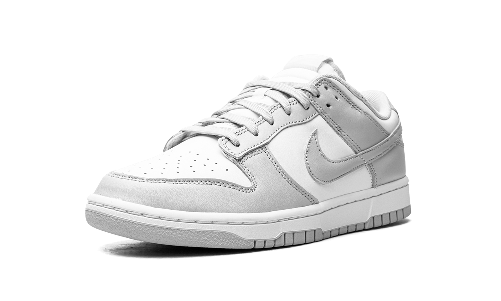The Nike Dunk Low “Grey Fog” is a two-tone, white-and-grey colorway of the low-top sneaker that is perfect for styling multiple ways. The “Grey Fog” edition of the Dunk mimics the shoe’s original two-tone style that was popularized by the “Be True to Your School” collection of college basketball-inspired colorways released by Nike in 1985. The upper features white leather on the perforated toe, mid-panel, collar, and heel. Both the overlay panels and Swoosh branding appear in Grey Fog leather. On the back, white “Nike” branding gives the shoe a retro appearance. Classic “Nike” and Swoosh detailing appears on the tongue tag. Release date: September 21, 2021