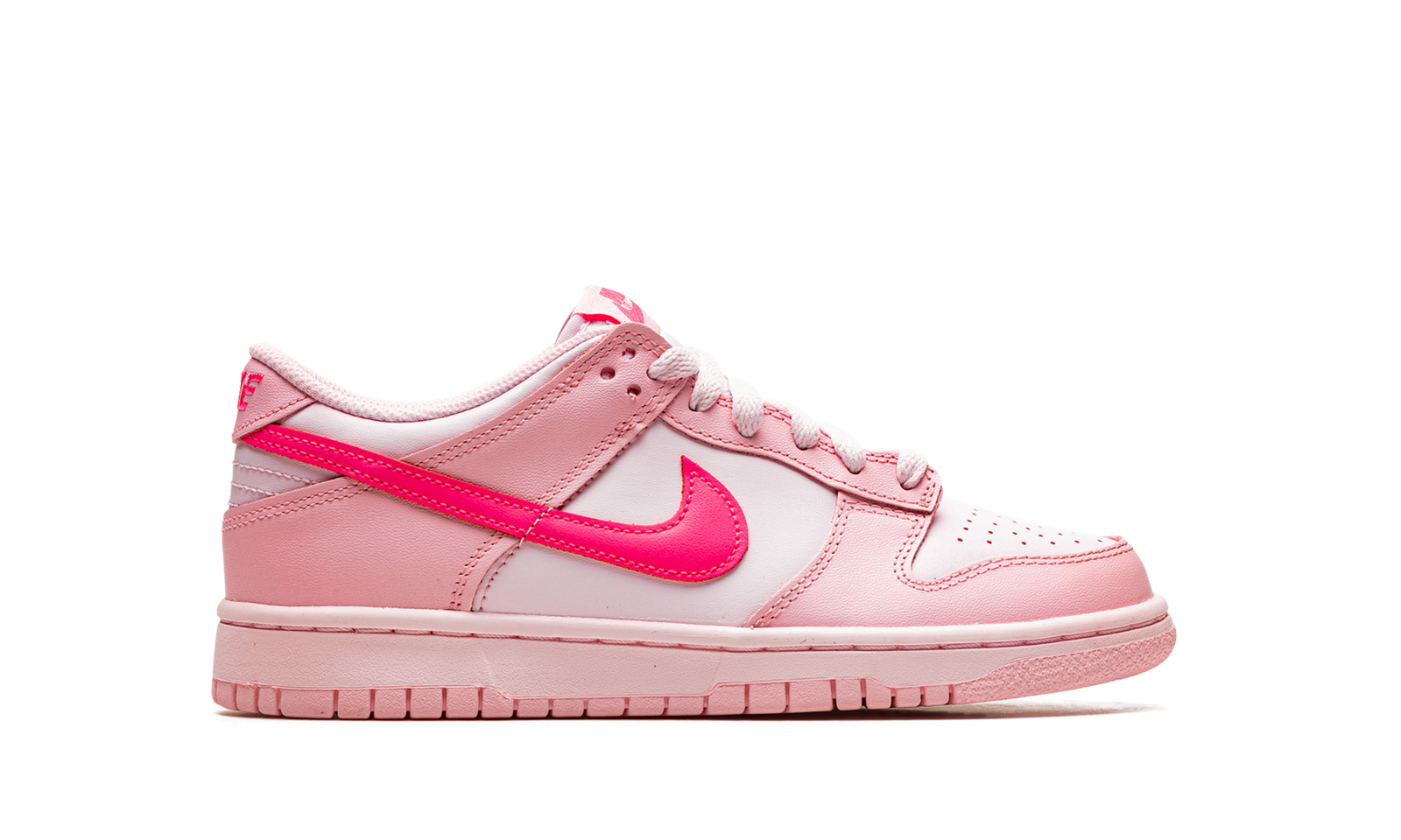 The Nike Dunk Low GS “Triple Pink” is the youth sizing of the vintage basketball shoe in a colorway featuring various shades of pink. The “Triple Pink” features light pink leather on the perforated toe, mid-panel, collar, and heel. The overlays are designed in a medium shade of pink leather. A neon pink leather Swoosh is found on both sides of the shoe. The same shade of pink appears on the “Nike” branding embroidered on the heel and the “Nike” and Swoosh detailing on the tongue tag. The shoe’s all-pink appearance is continued on the midsole and outsole.