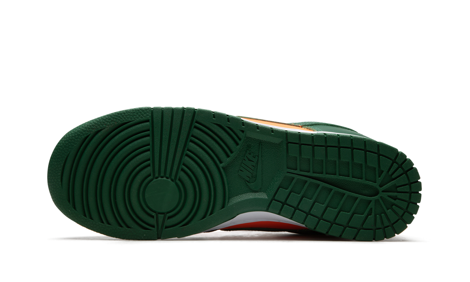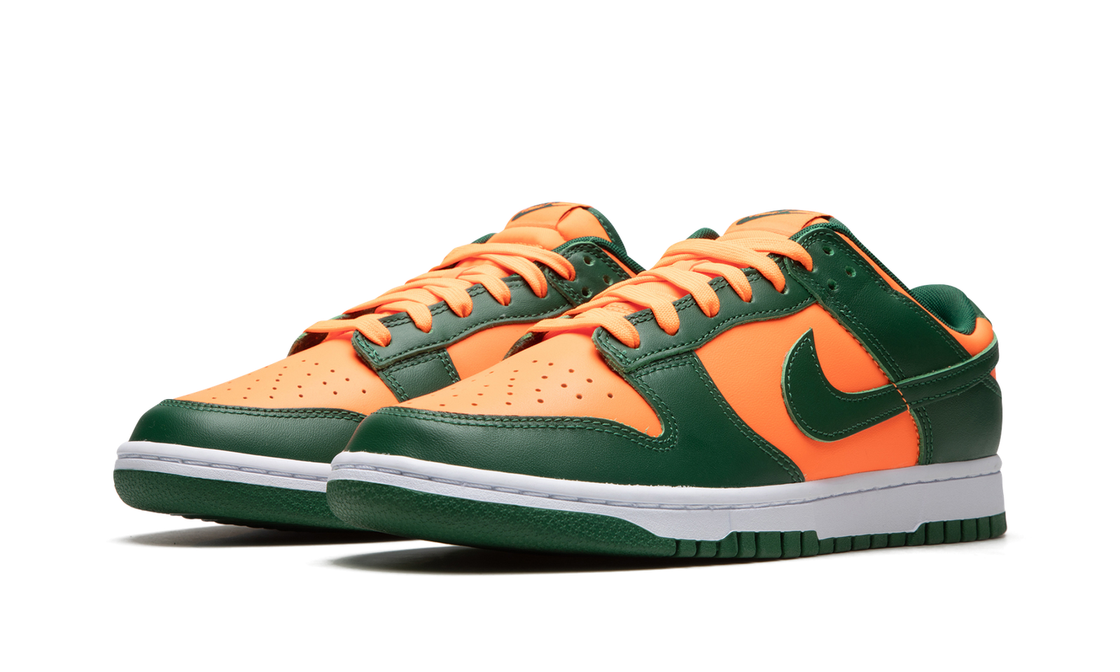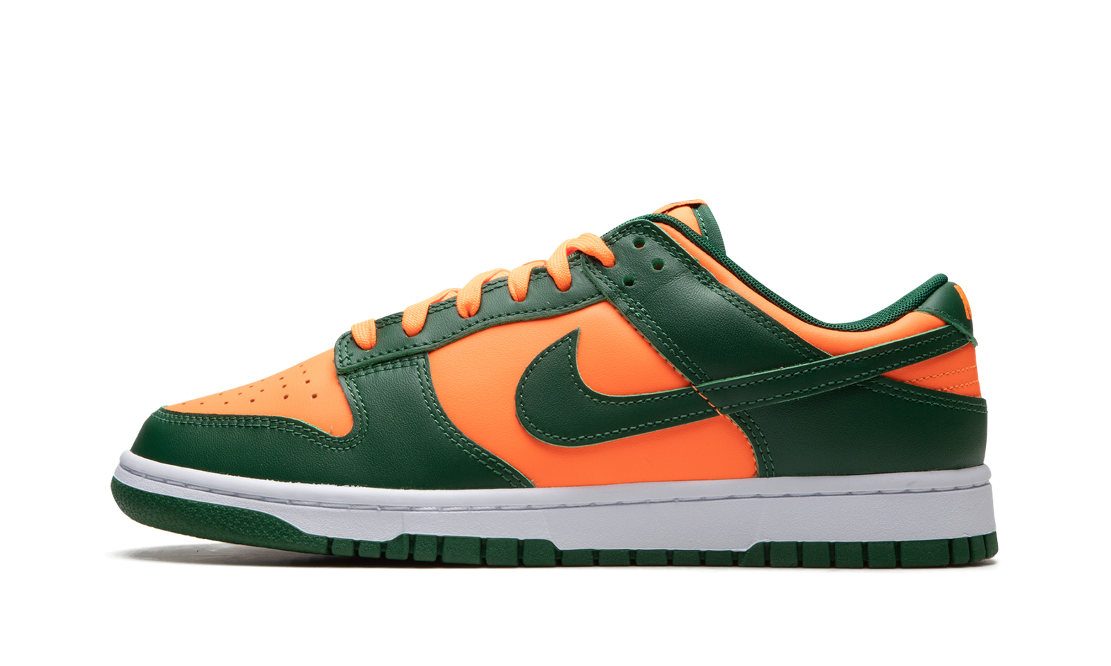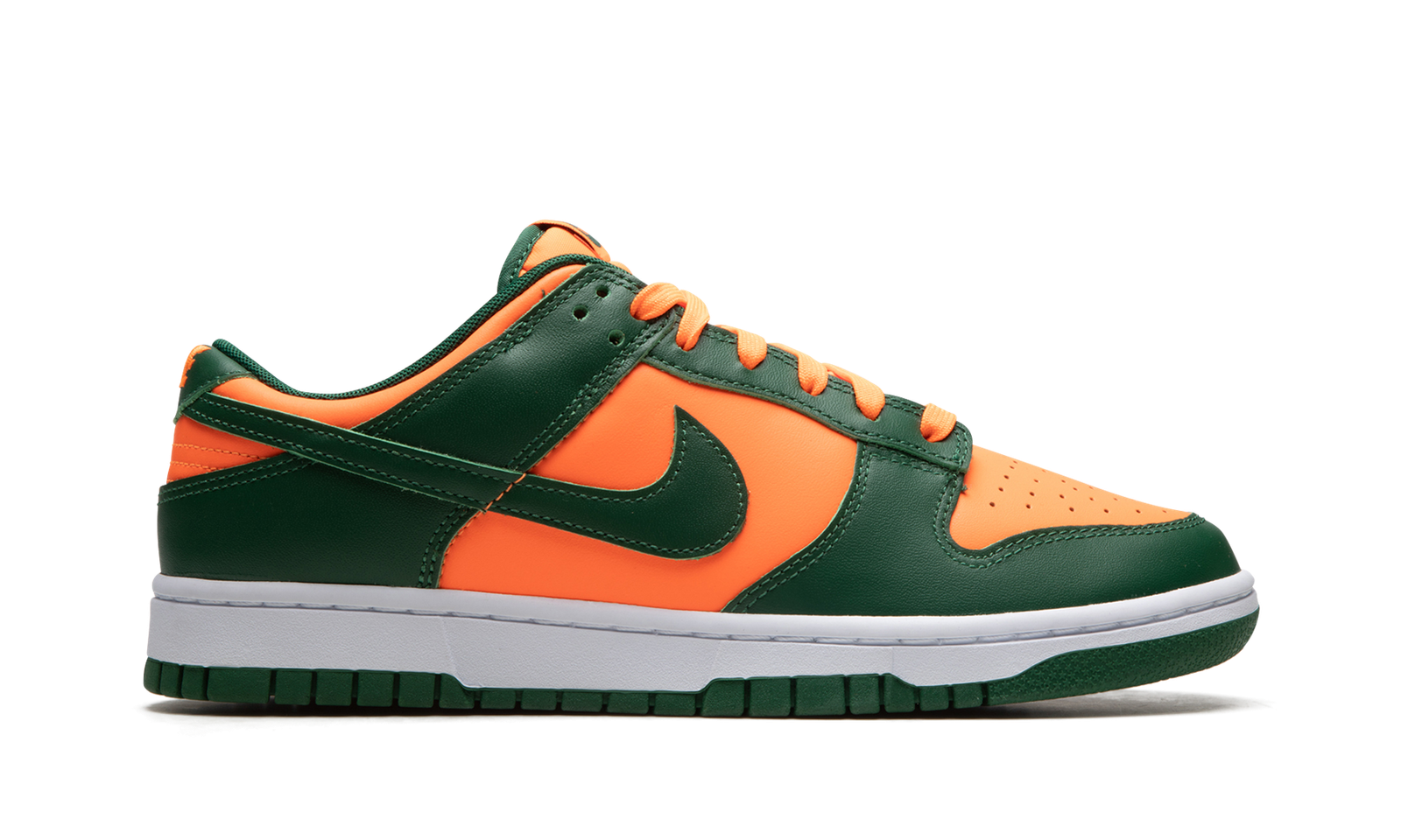 The Nike Dunk Low “Miami Hurricanes” is a colorway of the classic sneaker that is an unofficial nod to the team uniform colors of the Miami Hurricanes college basketball team. The perforated toe, mid-panel, collar, and heel all appear in orange leather. Contrasting Team Green leather is found on the overlays and Swoosh. Fiery orange “Nike” detailing is embroidered on the heel and green “Nike” and Swoosh logos appear on the orange nylon tongue tag on the tonal nylon tongue. A white midsole and Team Green rubber outsole complete the look. Release date: November 1, 2022