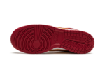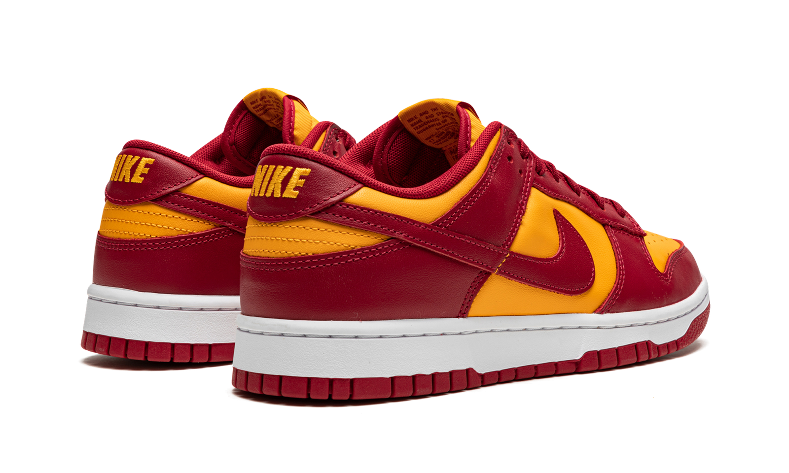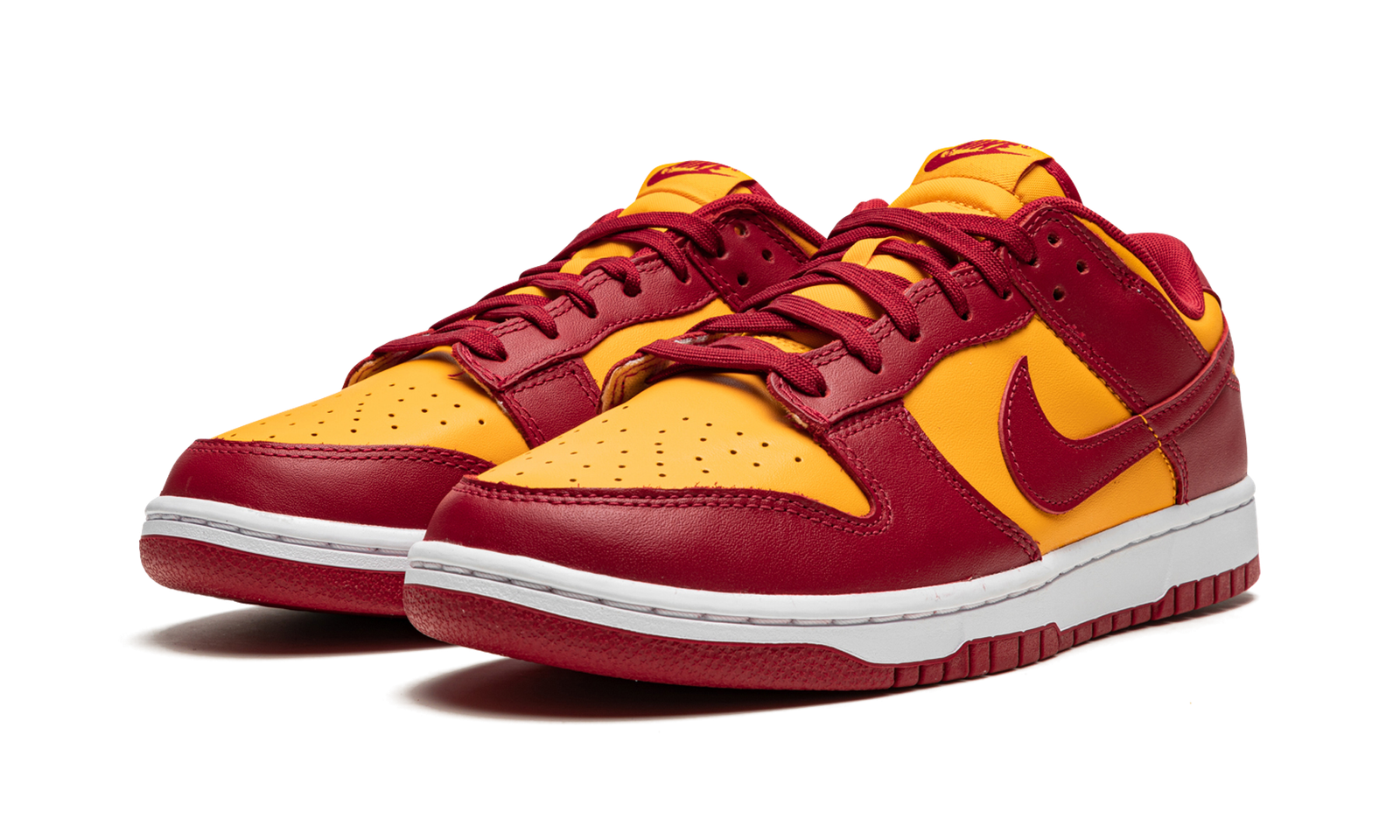 The Nike Dunk Low “Midas Gold” is a two-tone, yellow-and-red look for the low-top shoe by Nike. Arranged in a two-tone color block made popular by the college basketball-inspired Dunks from 1985’s “Be True to Your School” collection, the Midas Gold is an unofficial nod to the team uniform colors of the USC Trojans (or even Iowa State Cyclones) college basketball team(s). The perforated toe, mid-panel, collar, and heel all appear in Midas Gold leather. Contrasting Tough Red leather can be found on the overlays and Swoosh branding. Gold “Nike” detailing is embroidered onto the heel and red “Nike” and Swoosh insignias are found on the gold nylon tongue tag. The two-tone look continues with red laces over the yellow nylon tongue. A white rubber midsole and Tough Red-colored outsole complete the look.
