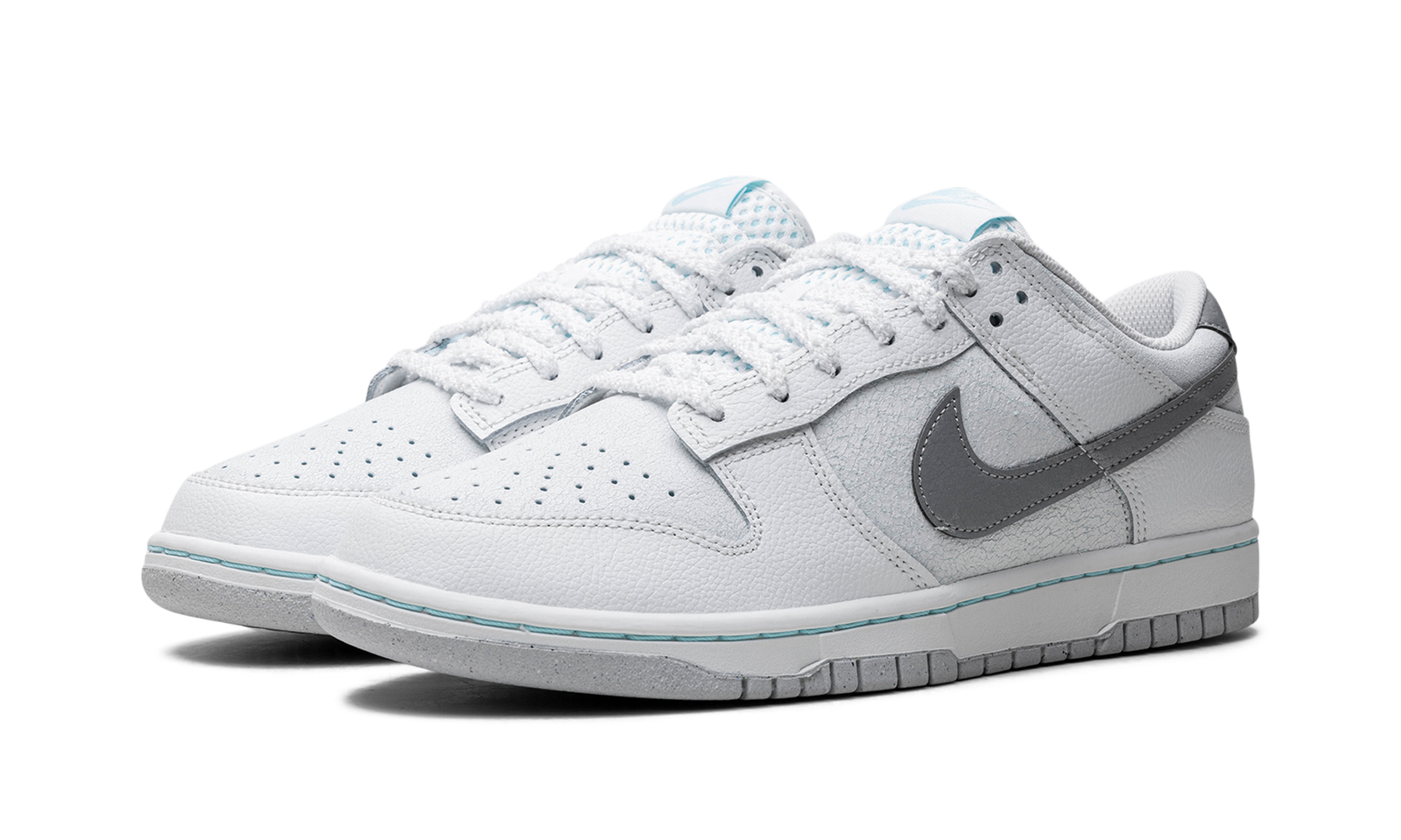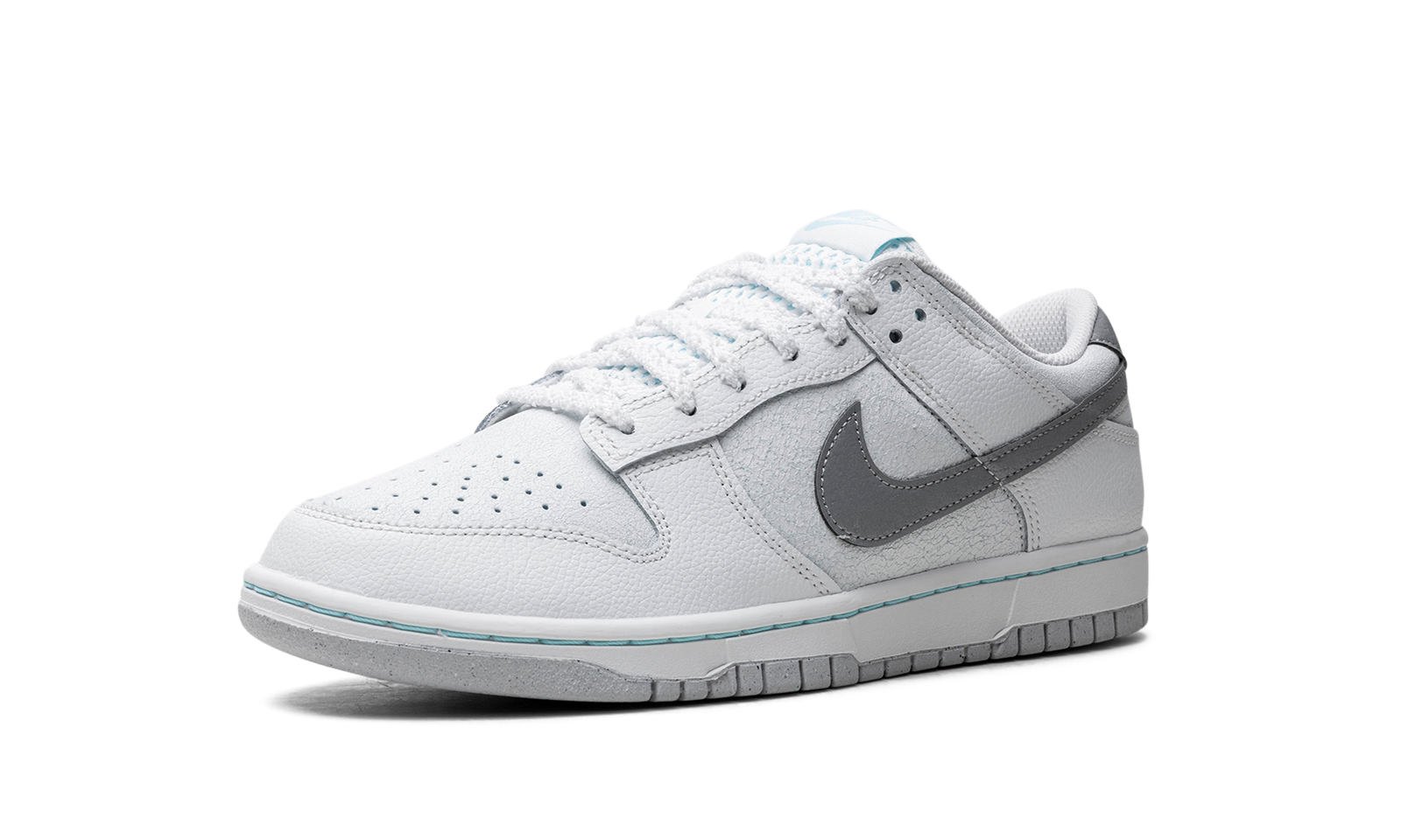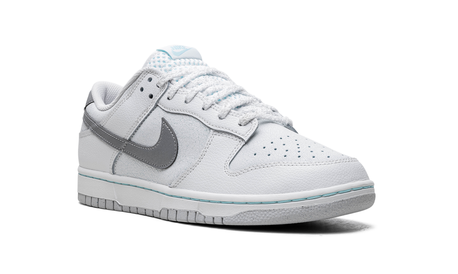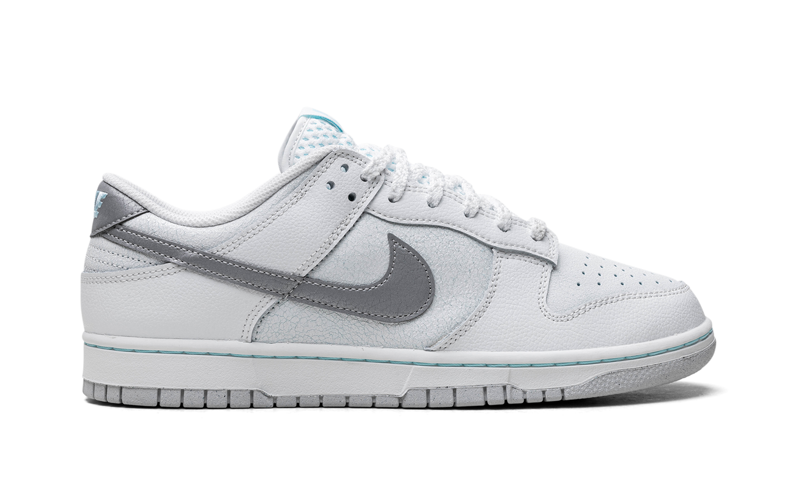 The Winter Storm Nike Dunk Low SE comes with a cracked leather upper in icy blue hues, with tumbled white leather overlays on the eyestay, heel, and forefoot.