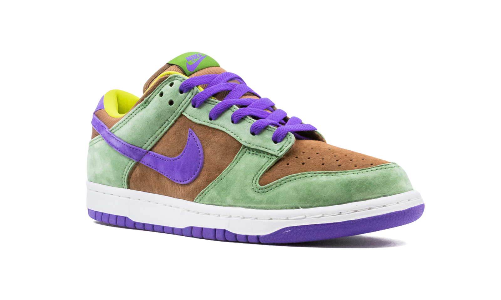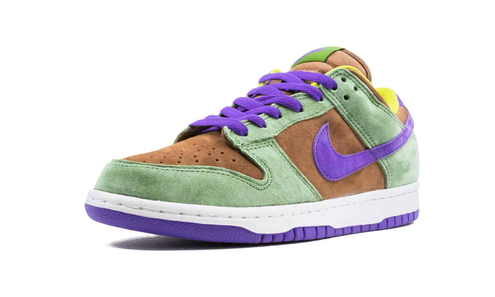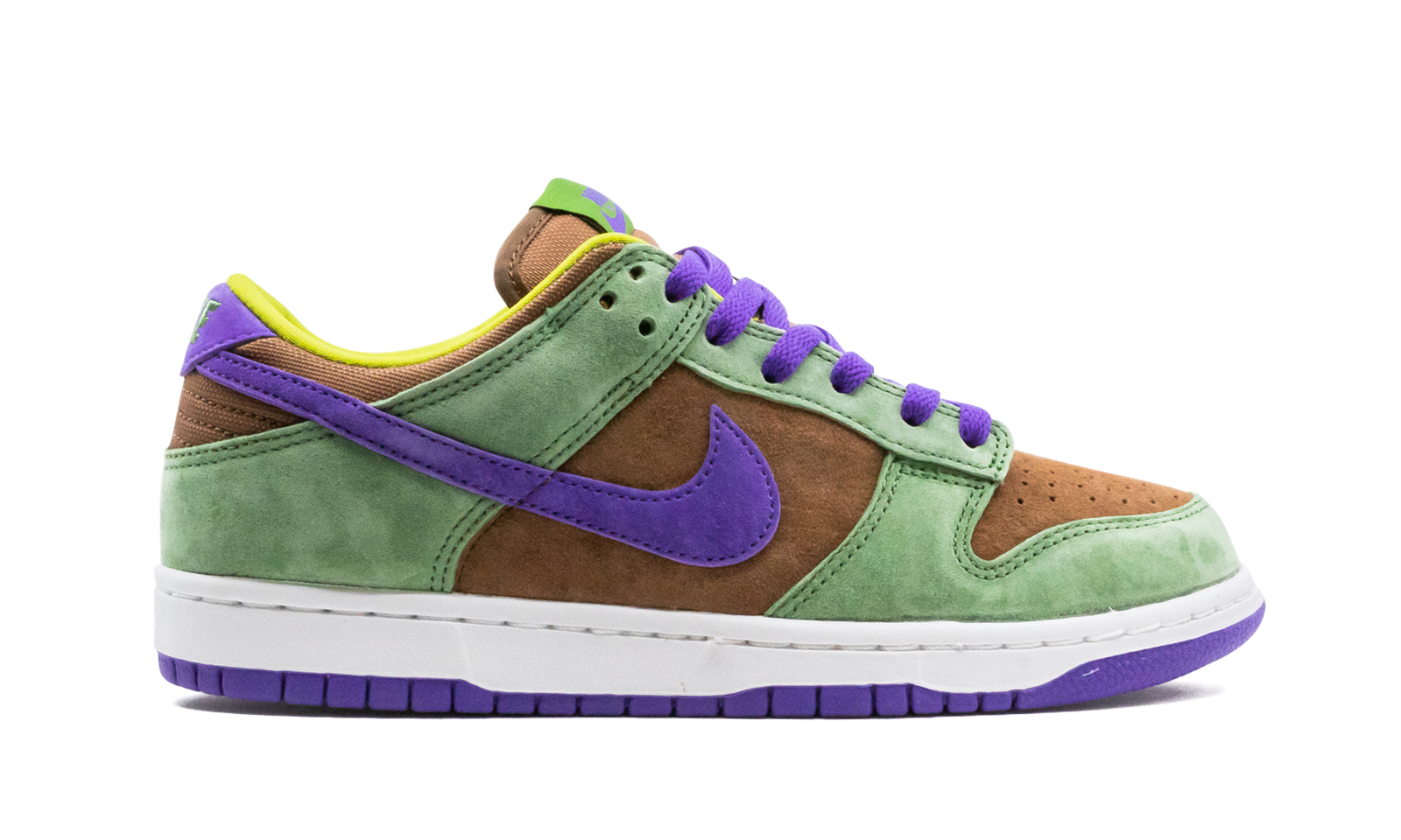 The Nike Dunk Low SP “Veneer” is a nostalgic colorway culled from Nike’s Co.Jp archives that was given a wide scale release in November 2020. The “Veneer” was originally one of three Dunks included in the “Ugly Duckling Pack,” a Japan-only release in 2001. It released alongside the “Plum” and “Ceramic” colorways, both of which were also brought back in 2020. The “Veneer” edition returns in true-to-original form as the same supple Autumn Green overlays appear on the forefoot, eyelets, collar, and heel. Brown or Veneer suede encompasses the perforated toe, mid-panel, nylon tongue, and collar. A contrasting shade of Court Purple on the laces and on the buttery suede Swoosh on either side adds a pop of color against the previously mentioned suede panels. Finishing touches include green Nike embroidery on the purple suede heel overlay, a white rubber midsole, and purple outsole. Release date: November 10, 2020.