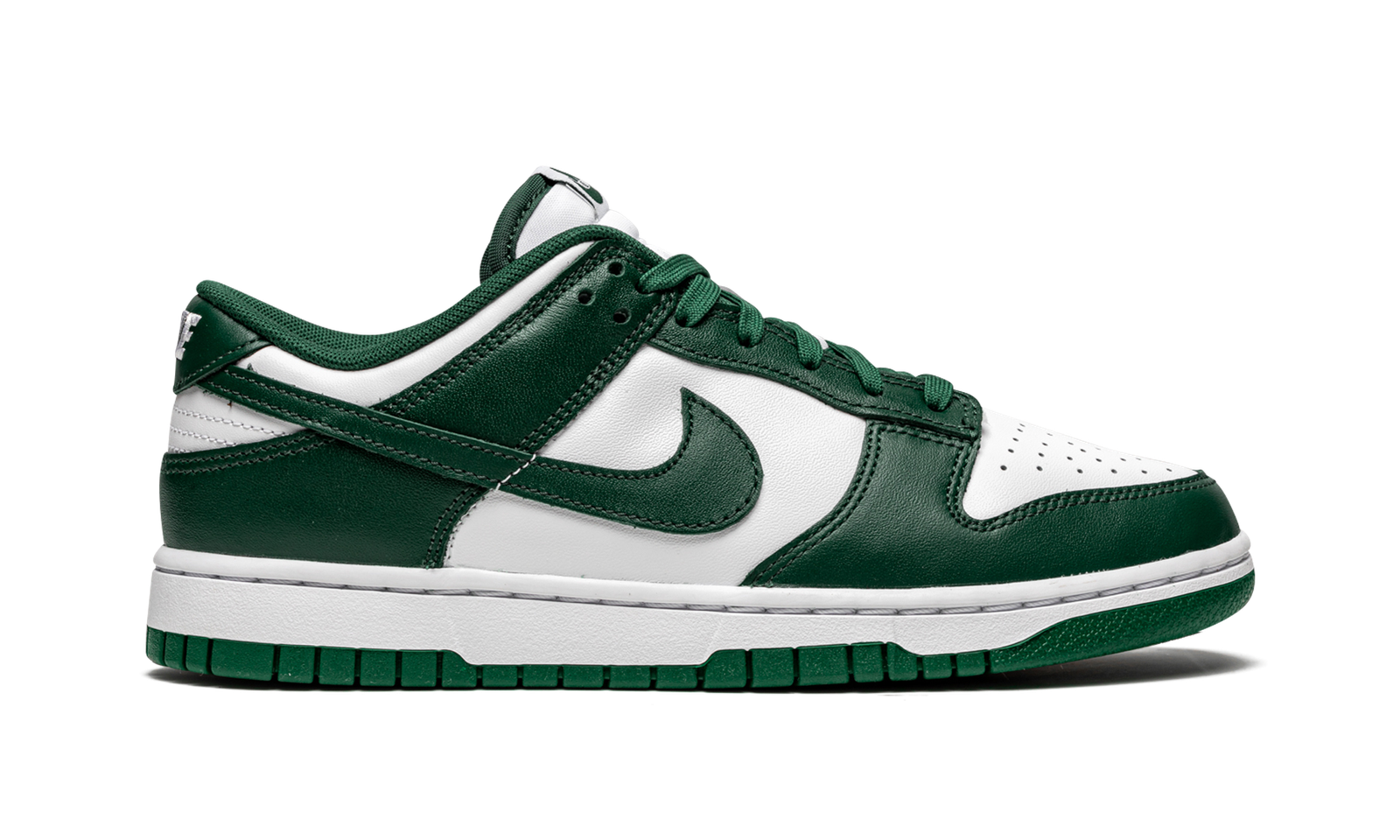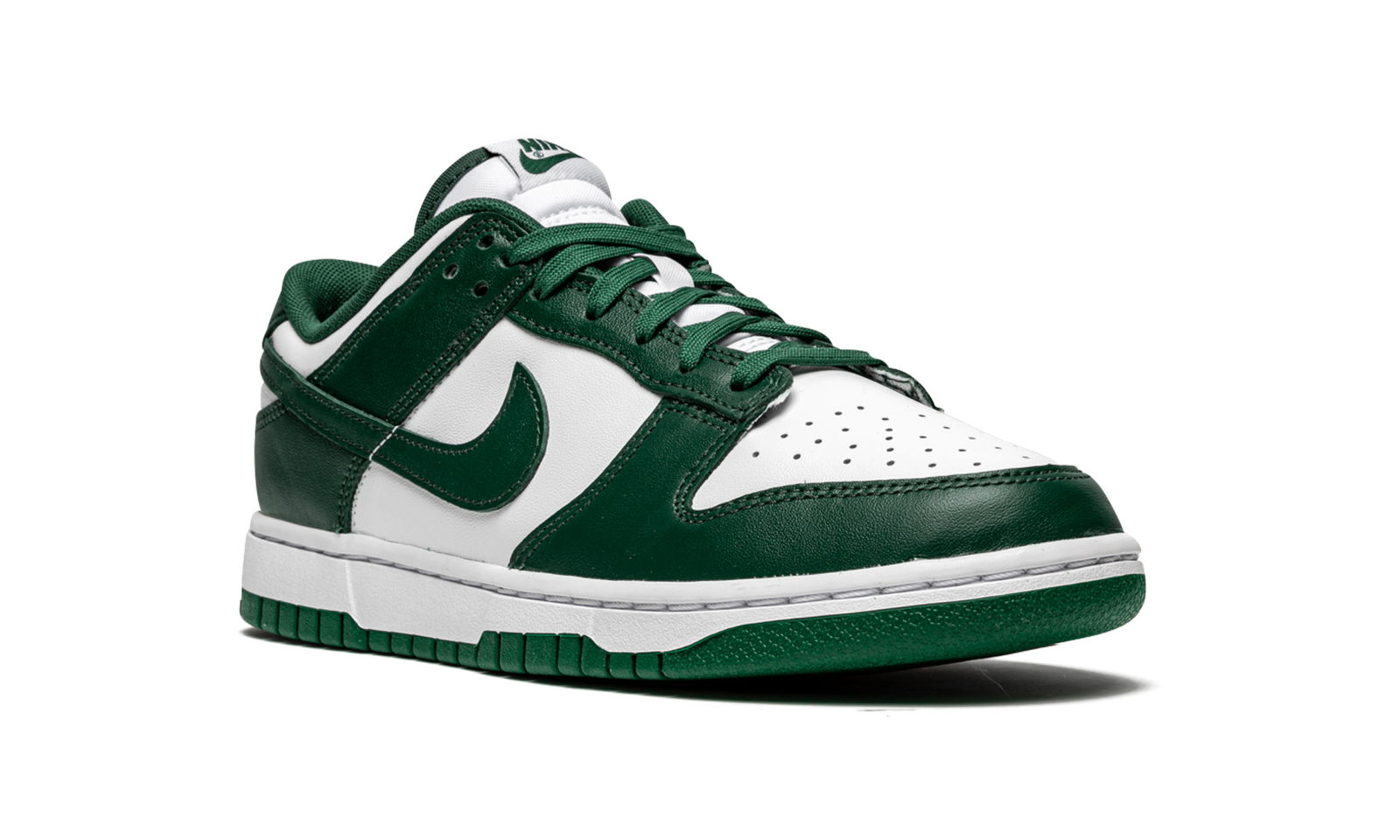 The Nike Dunk Low “Team Green” is based on team uniform colors of the Michigan State Spartans college basketball team. The “Team Green” is inspired by Nike’s original “Be True to Your School” pack that was dedicated to some of the top college basketball programs in the country during the mid-to-late 1980s. In 2020, Nike released the “Spartan Green” Dunk High, which is basically a high-top version of the “Team Green” seen here. Like the aforementioned design, the “Team Green” features a white leather base with contrasting Team Green leather overlaid panels. A green leather Swoosh appears on either side and white “Nike” detailing is embroidered on the heel. Green laces are layered over the white nylon tongue. A white midsole and green outsole finish off the look of the Nike Dunk Low based on the color block of the Michigan State Spartans’ team uniforms. Release date: April 16, 2021.