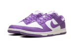 The women’s Black Rasperry Nike Dunk Low Next Nature has a smooth Summit White leather upper as its base. This color forms the sides, the perforated toe box, and the ankle area. Slightly shiny Black Raspberry purple overlays form the toe cap, eyestays, ankle strap, and heel, as well as the Nike Swooshes that adorn the sides.