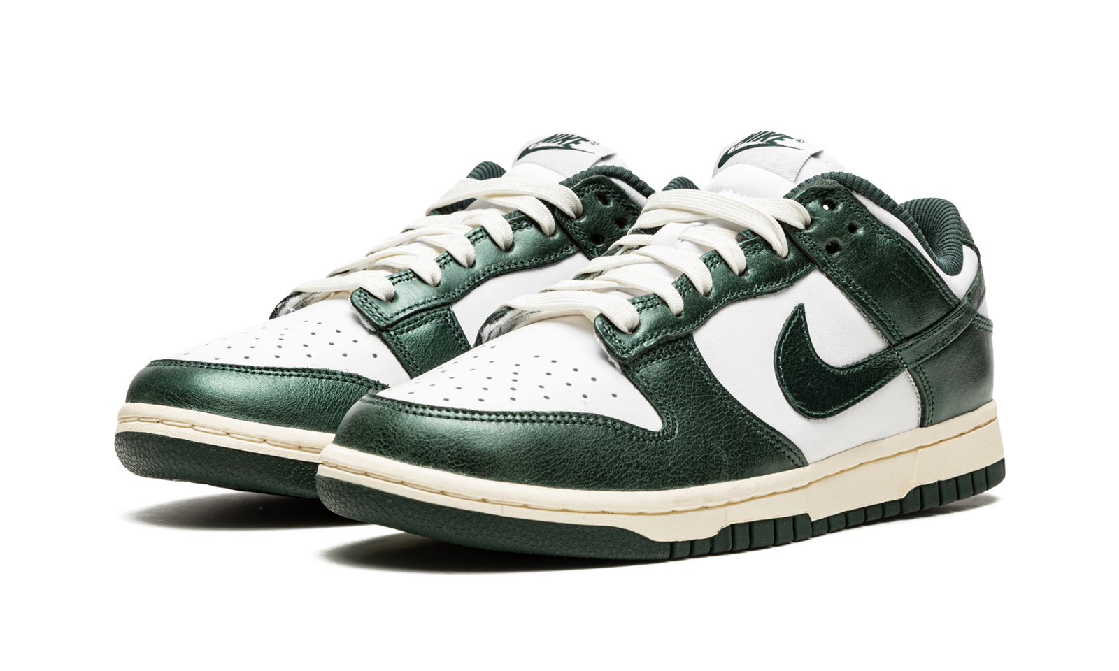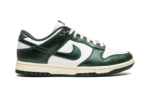 The Women’s Nike Dunk Low “Vintage Green” is a women’s-exclusive colorway of the classic sneaker with a collegiate flair. While not officially associated with the school, the “Vintage Green” is reminiscent of the Michigan State Spartans college basketball team, as it features the same green and white colors on its design as the Spartans’ team uniforms. Moreover, the “Vintage Green” honors the Dunk’s storied history as a mid-1980s college basketball team shoe with its aged, vintage look. The cream rubber midsole mimics the oxidation process rubber undergoes after years of use. Up top, the shoe features a white leather base. The Vintage Green leather overlays and Swoosh branding have a slight sheen and textured finish that mimics the look and feel of vintage leather. Cream white laces complete the throwback-inspired look.