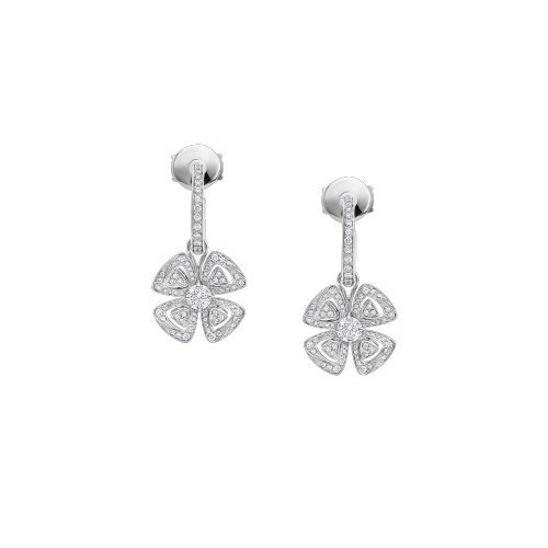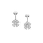 Blooming in the Eternal City of Rome, the Fiorever collection draws its inspiration from the charming four-petal flower cherished by the Romans as a symbol of happiness and joy. Made up of two words rich in meaning:Fiore (flower in Italian) and forever (eternity in English), Fiorever celebrates the Romans’ love of life with a passionate, free-spirited design. Precious, classic floral motifs are presented in a corolla of high-quality diamonds, radiating a timeless and radiant light. Fiorever 18K white gold hoop earrings with two round brilliant-cut diamonds in the center and embellished with pavé diamonds.