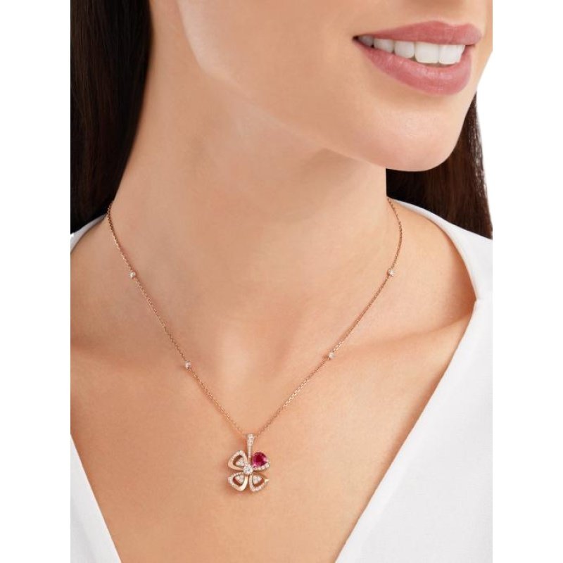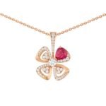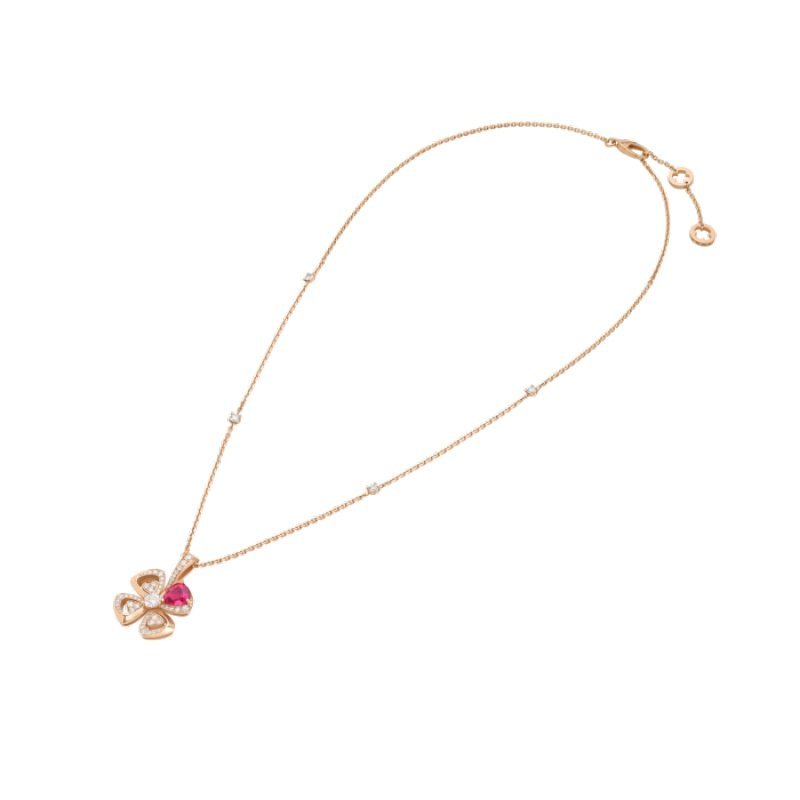 The 18K rose gold Fiorever necklace features a delicate corolla with brilliant gemstones, inspired by the charming four-petal flower cherished by the Romans as a symbol of happiness and joy. The floral motif features Bvlgari’s signature colors and is embellished with precious diamonds that exude timeless elegance, while the rubellite petals combine depth, exquisite shape and radiance.
