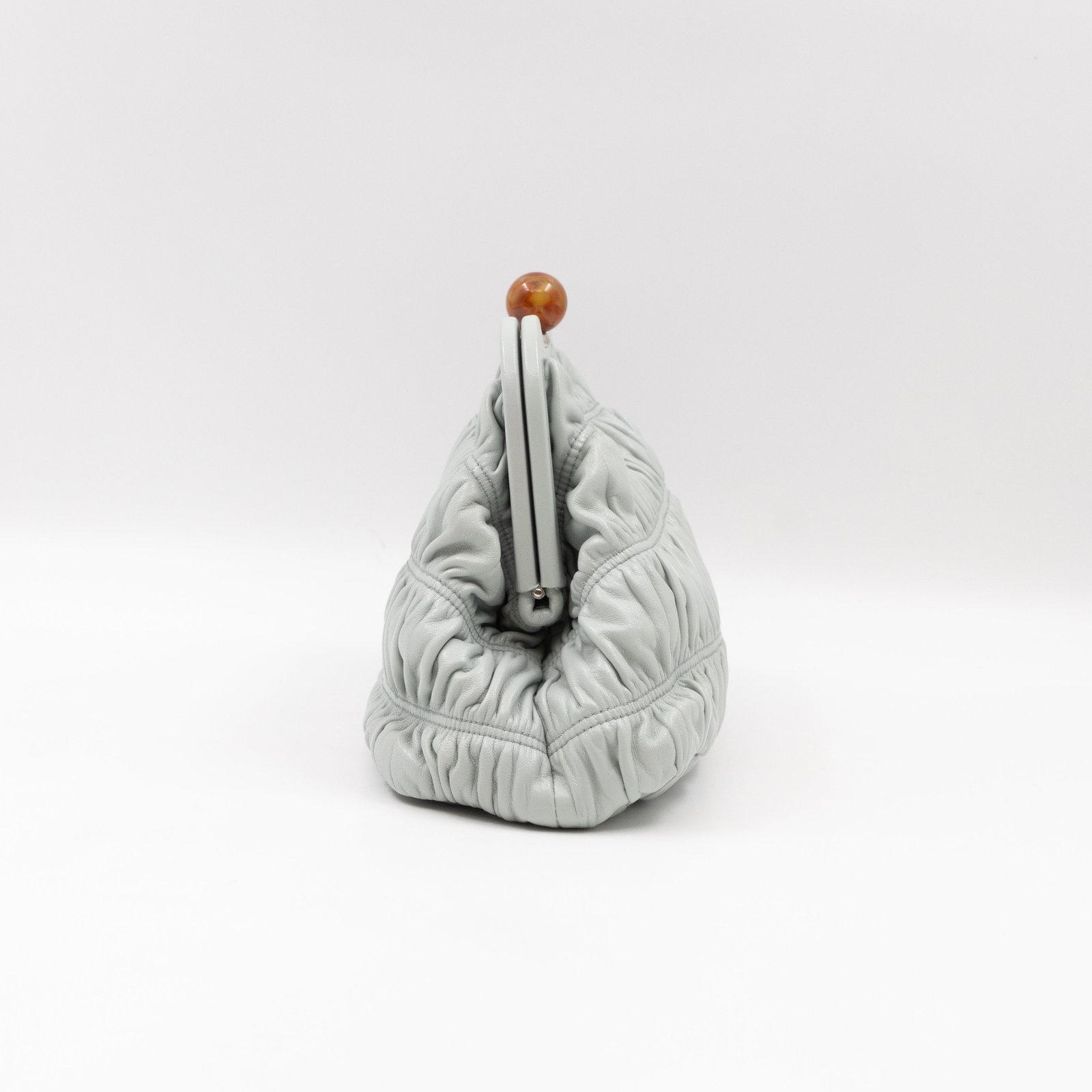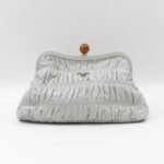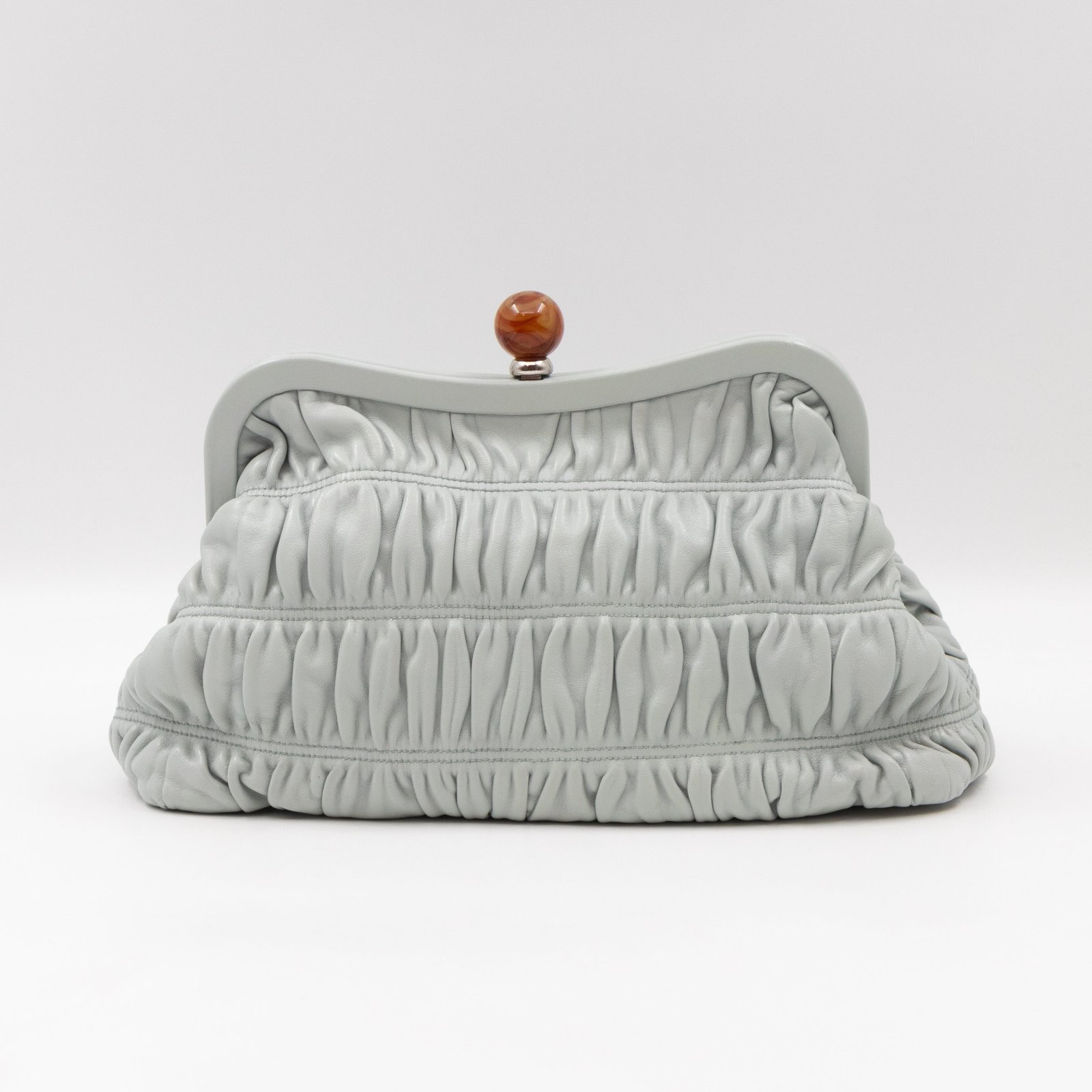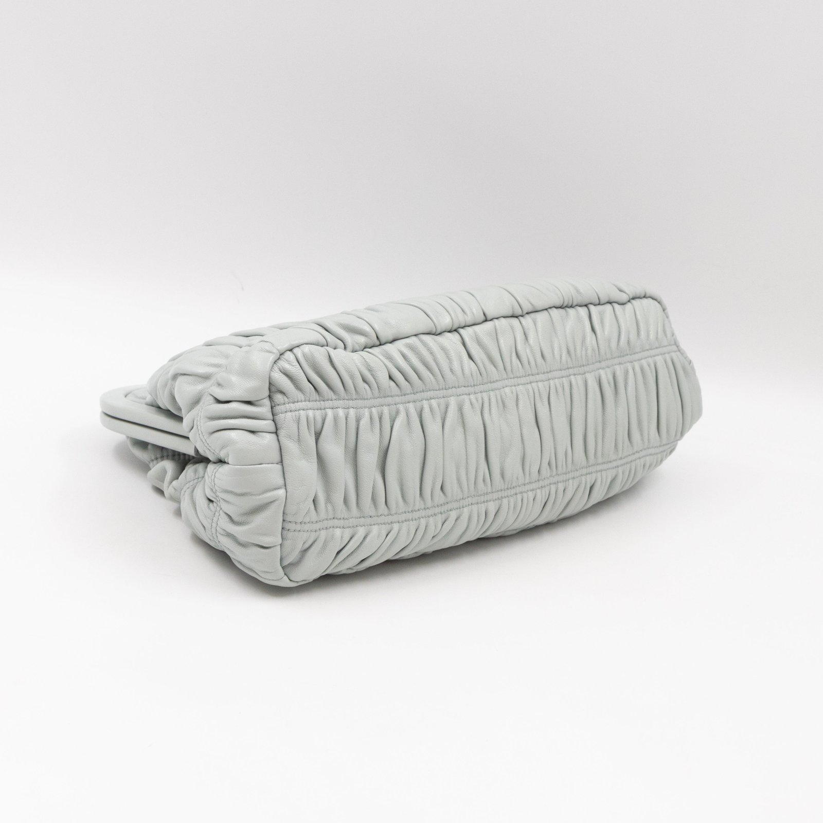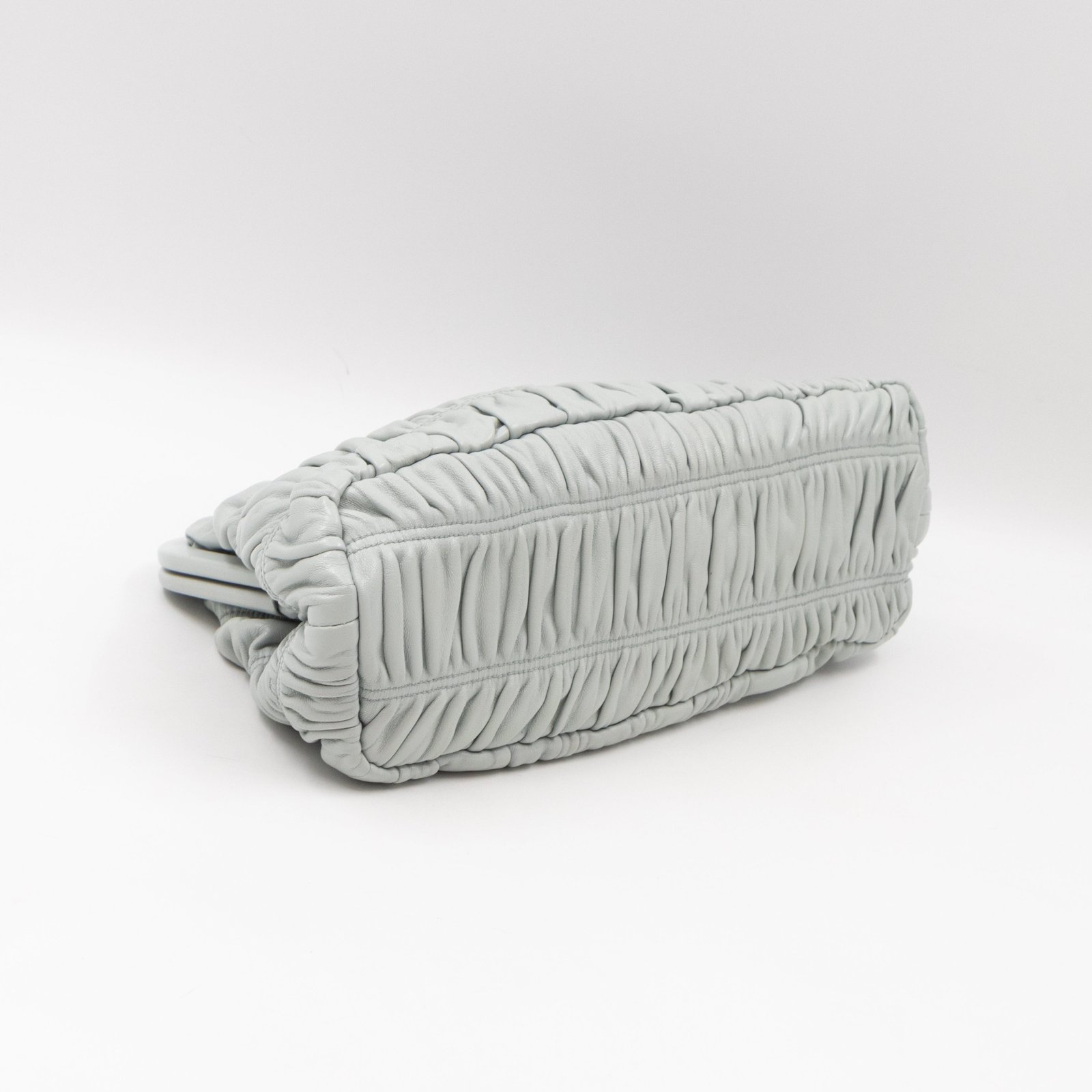 This is a Frame clutch bag from Prada. It is made with gaufre leather in light blue colour, features a silver-tone Prada logo on the front. The interior is spacious enough with a zipper pocket and a slim pocket. Opens with a small circle ball closure. A good choice for an evening event or daily use.