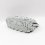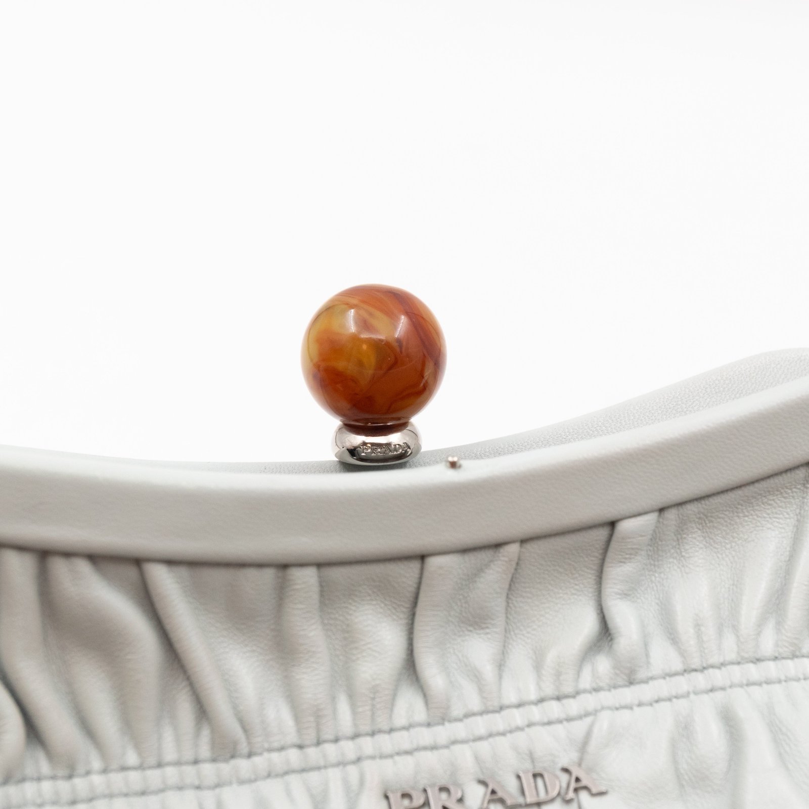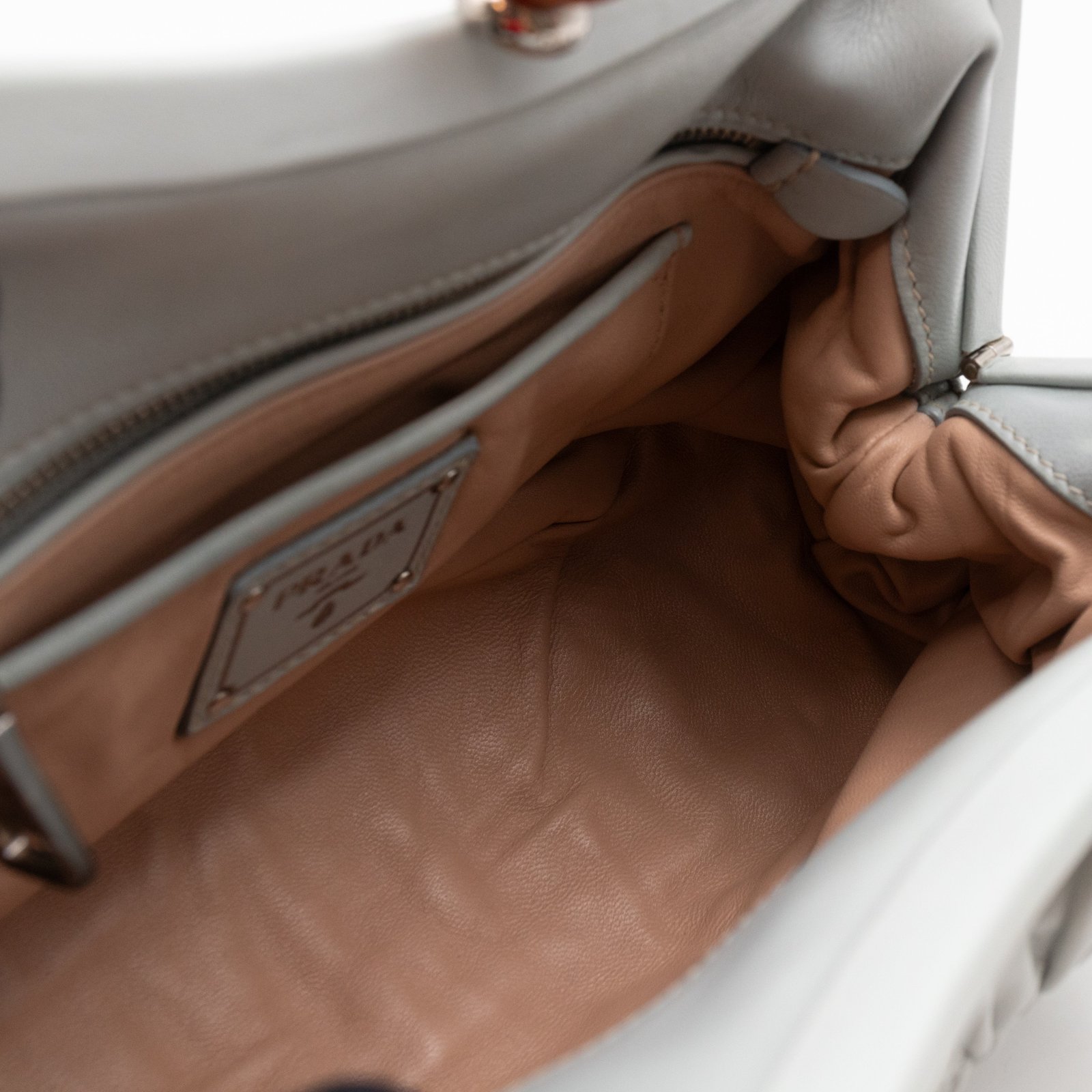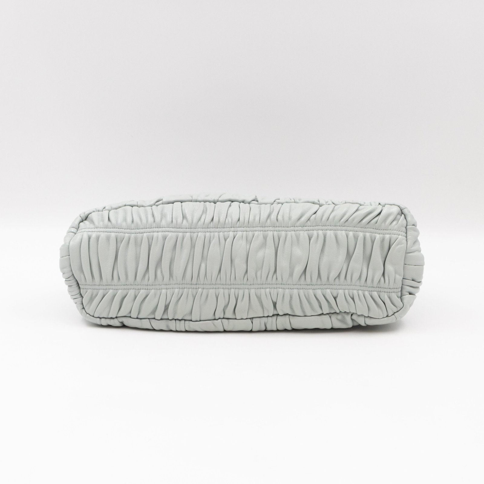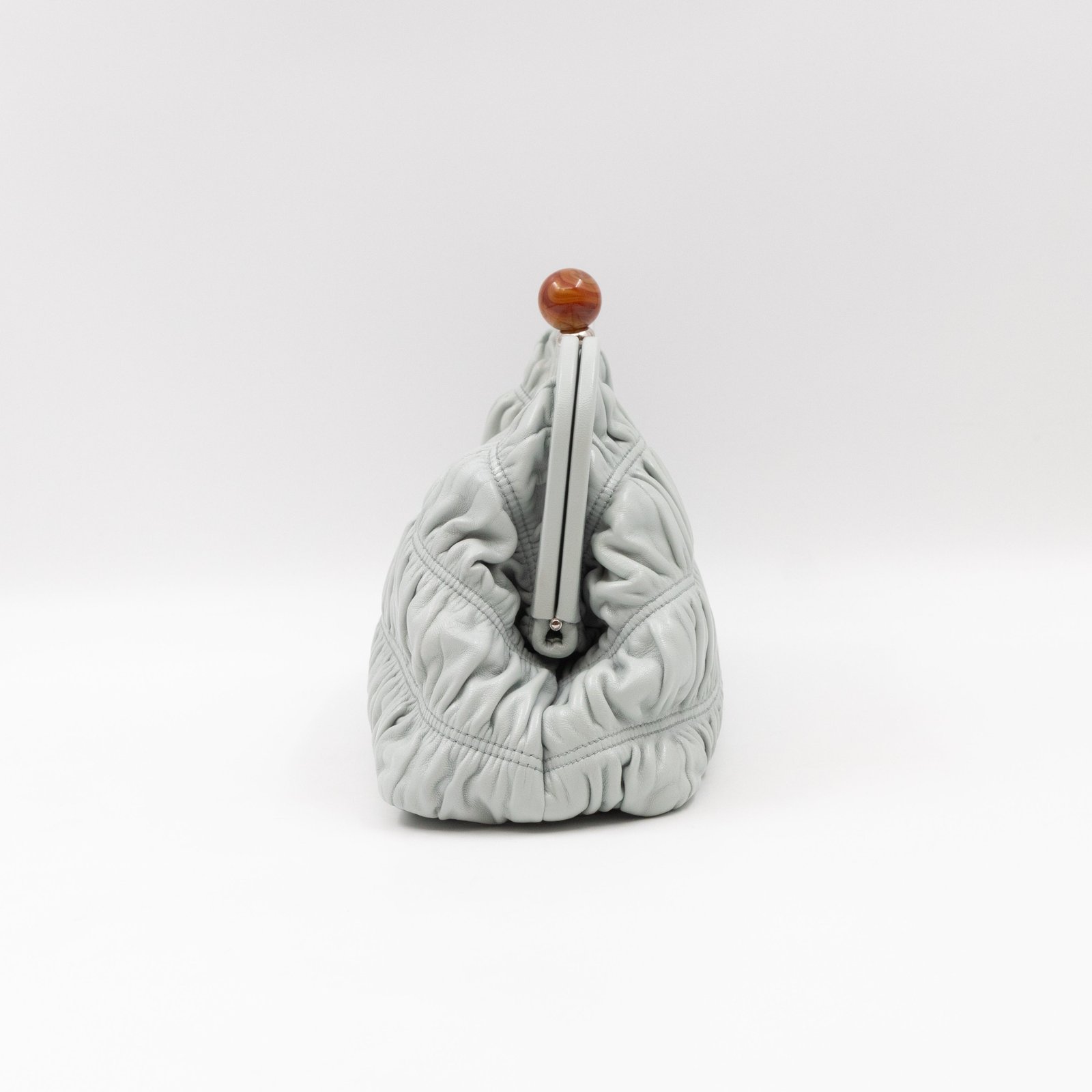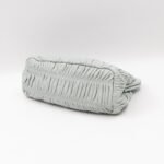 This is a Frame clutch bag from Prada. It is made with gaufre leather in light blue colour, features a silver-tone Prada logo on the front. The interior is spacious enough with a zipper pocket and a slim pocket. Opens with a small circle ball closure. A good choice for an evening event or daily use.