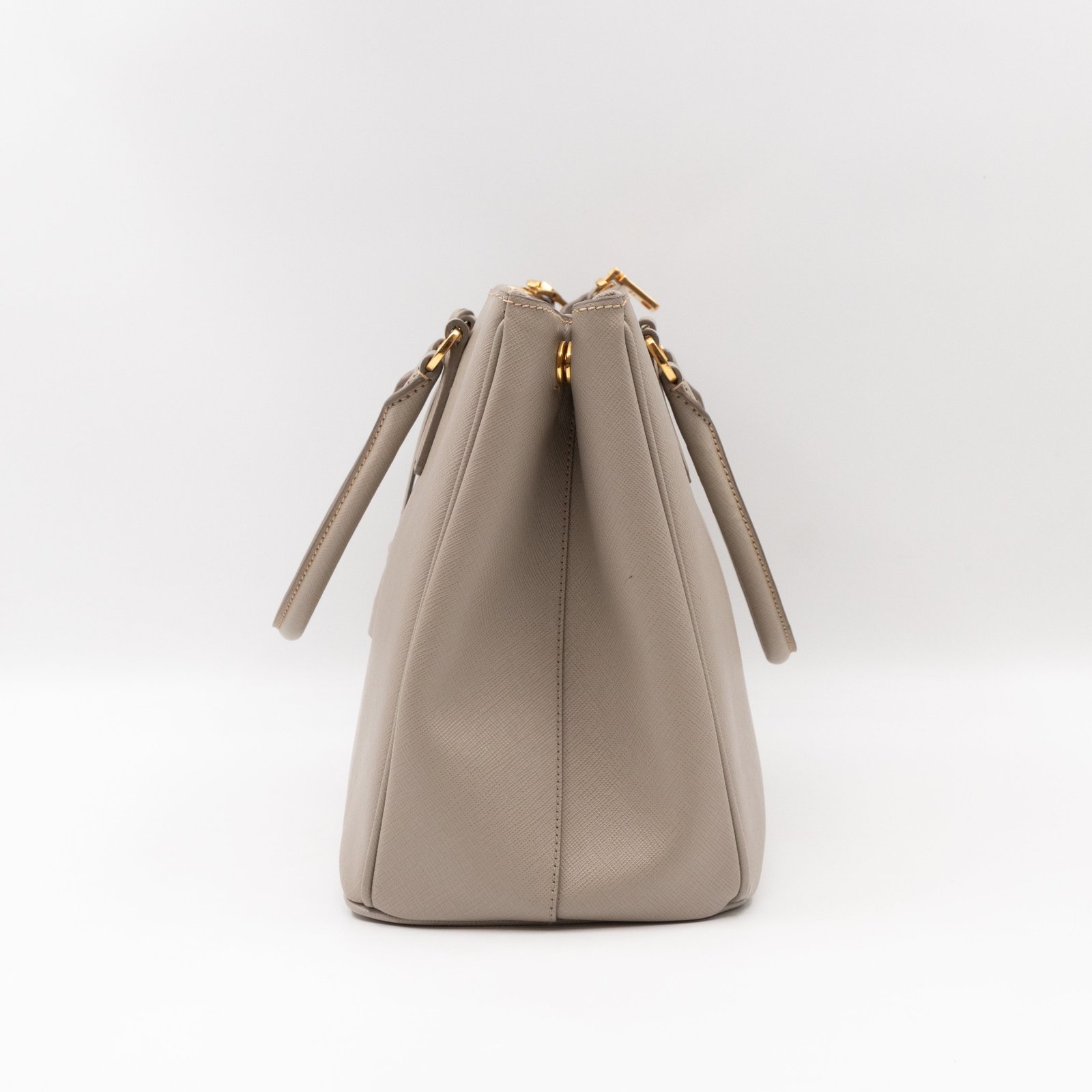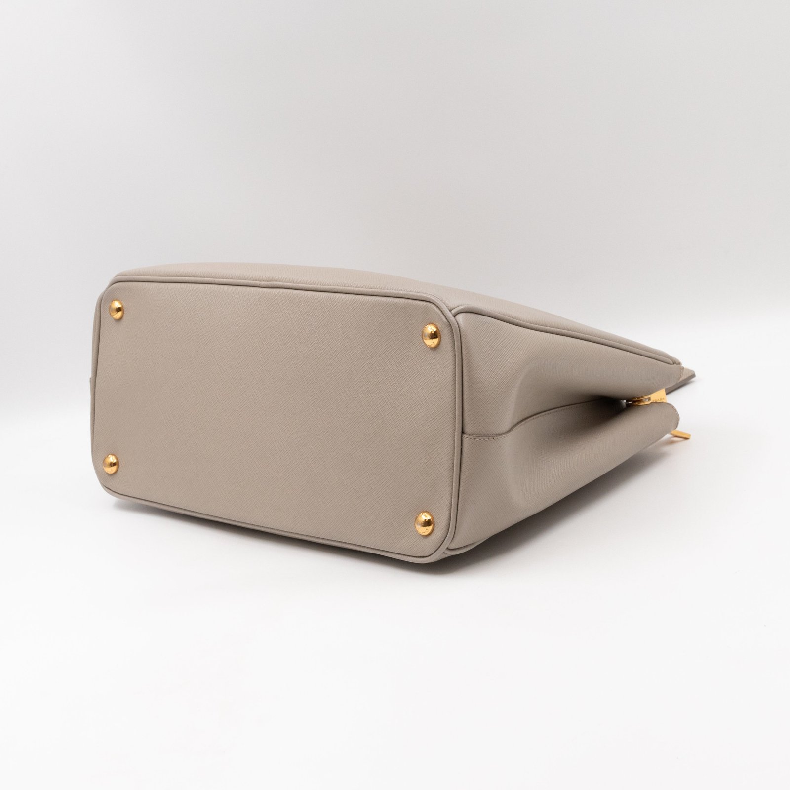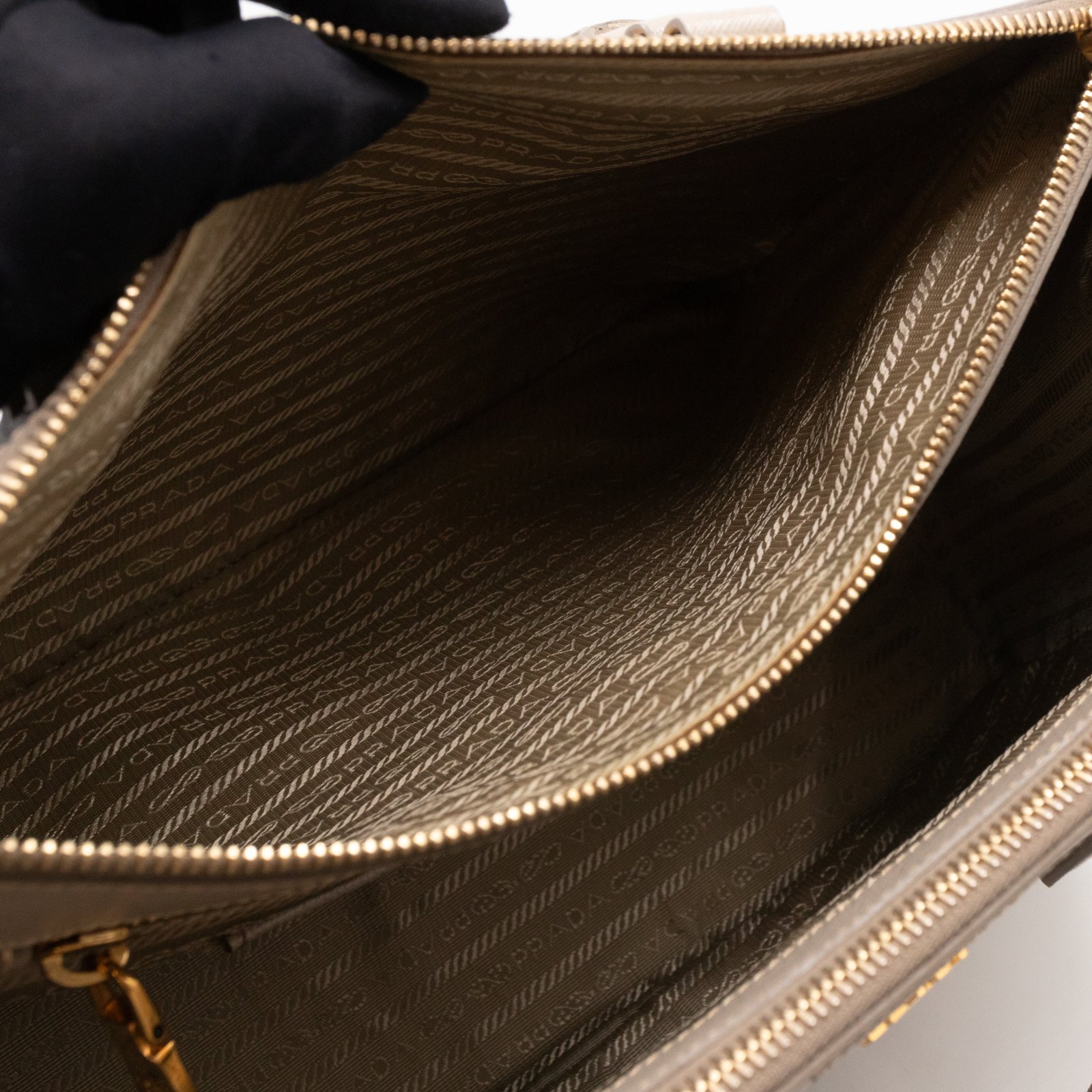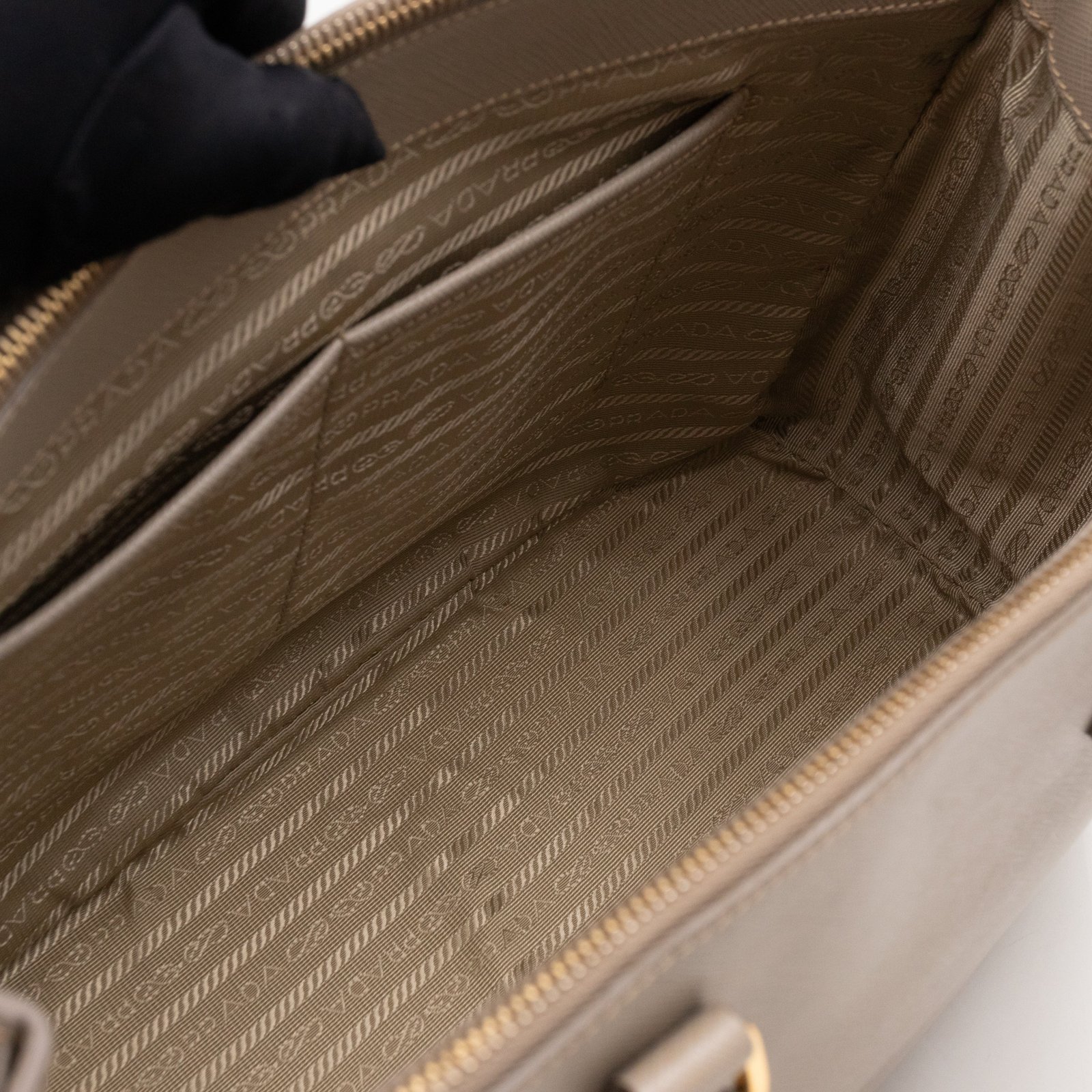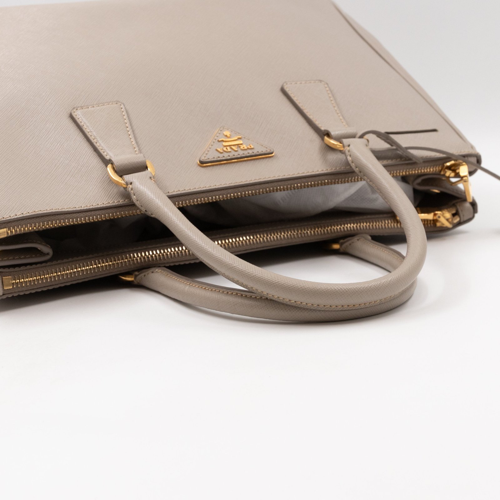 A Prada Galleria Large Double Zip bag in durable Saffiano leather. Very convenient double zipper bag in a grey taupe color, combined with gold-tone hardware. This larger size fits your ipad, wallet, documents and even a small laptop. Great choice for daily and work use. Each side has zipper pockets, the middle compartment expands to a spacious size. Current retail price €4000.
