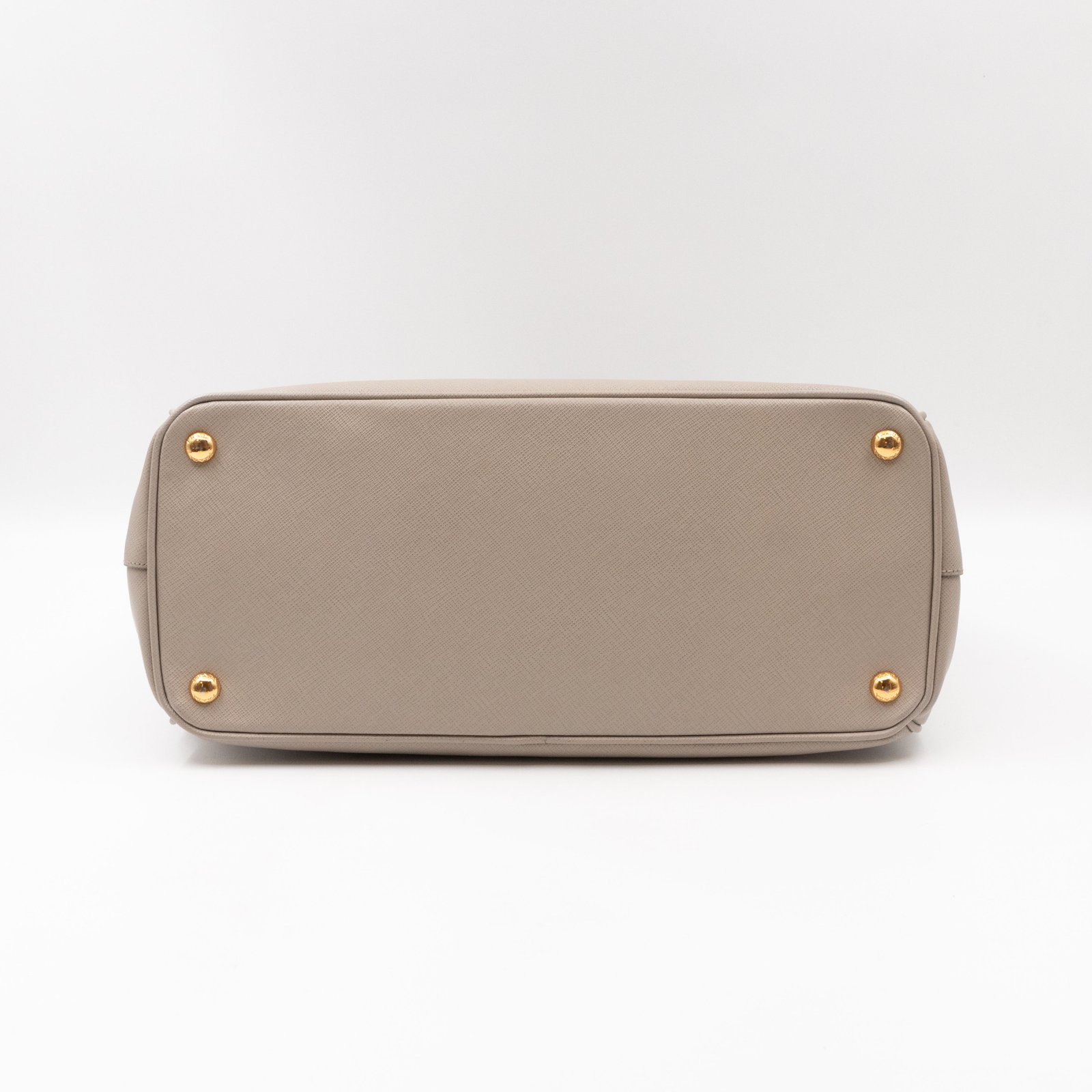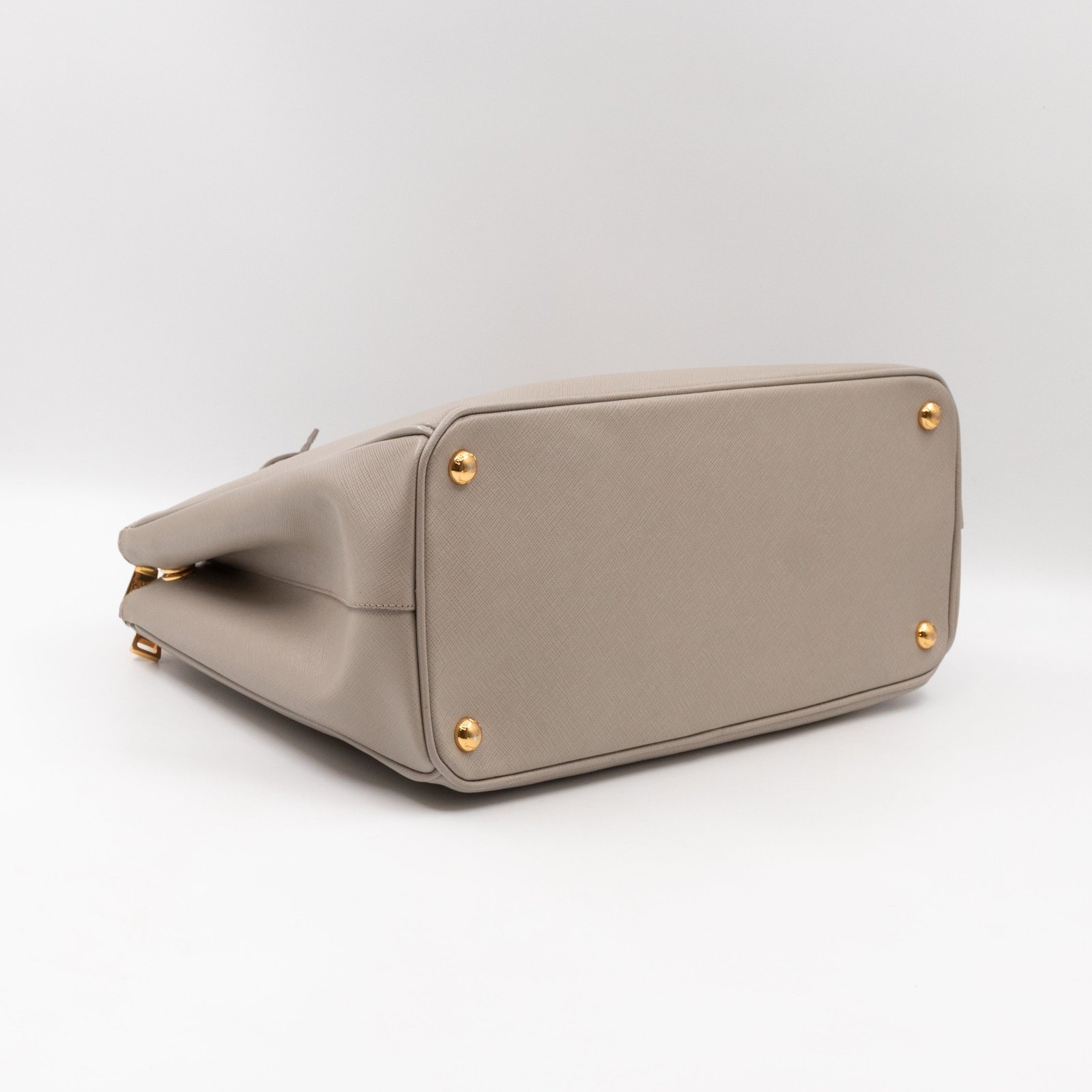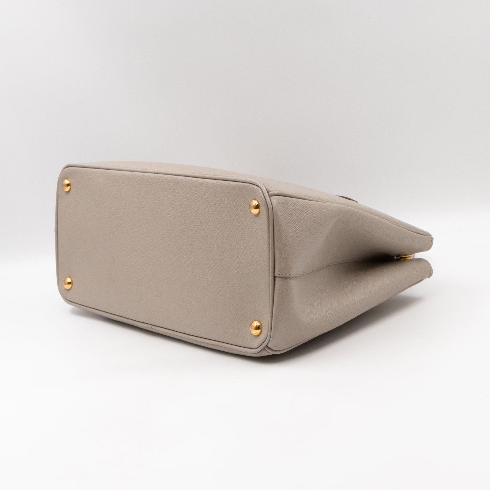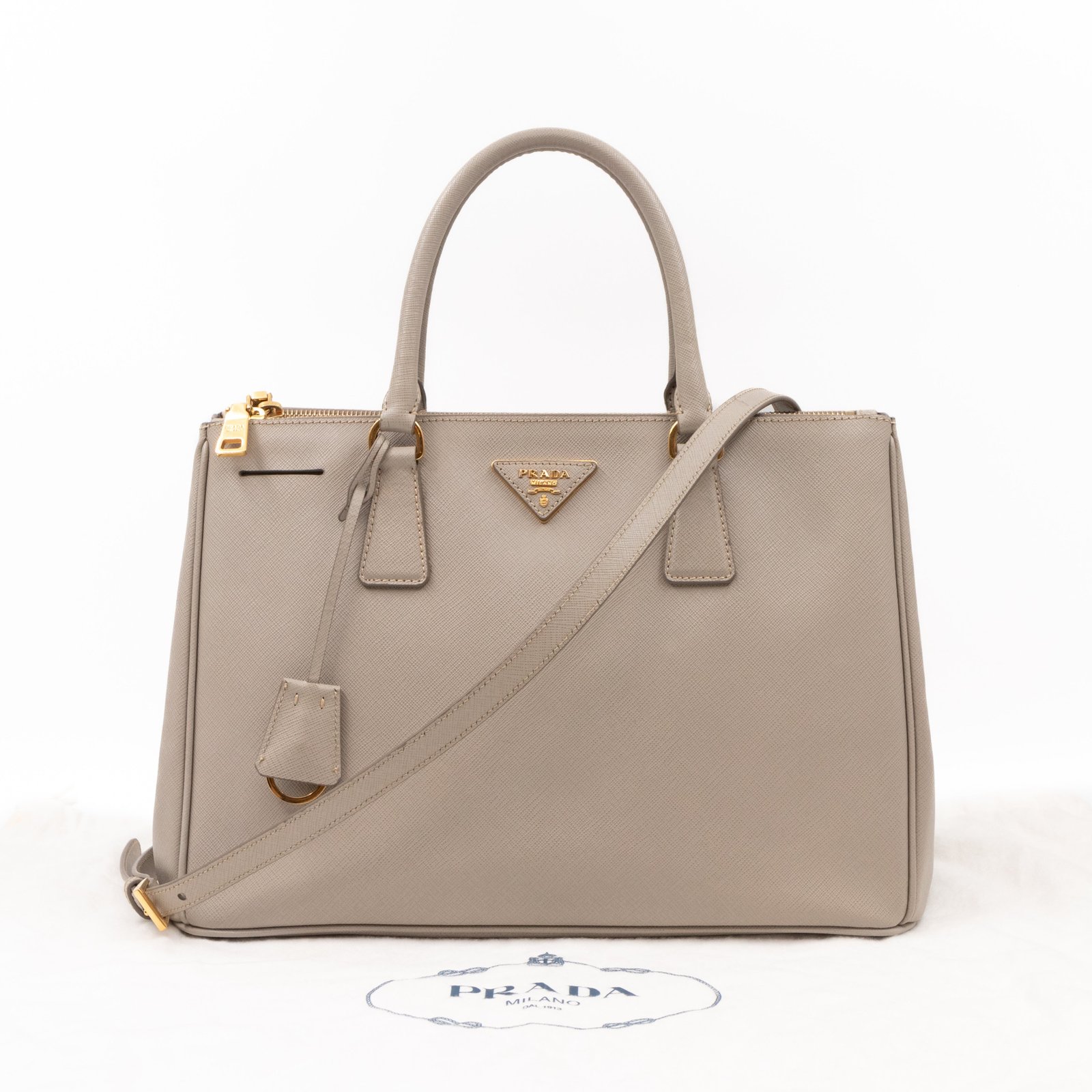 A Prada Galleria Large Double Zip bag in durable Saffiano leather. Very convenient double zipper bag in a grey taupe color, combined with gold-tone hardware. This larger size fits your ipad, wallet, documents and even a small laptop. Great choice for daily and work use. Each side has zipper pockets, the middle compartment expands to a spacious size. Current retail price €4000.