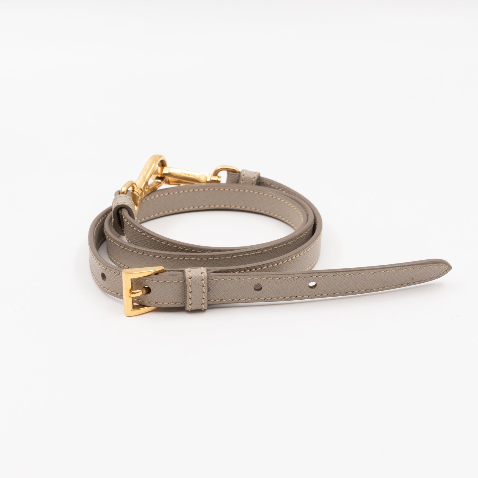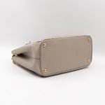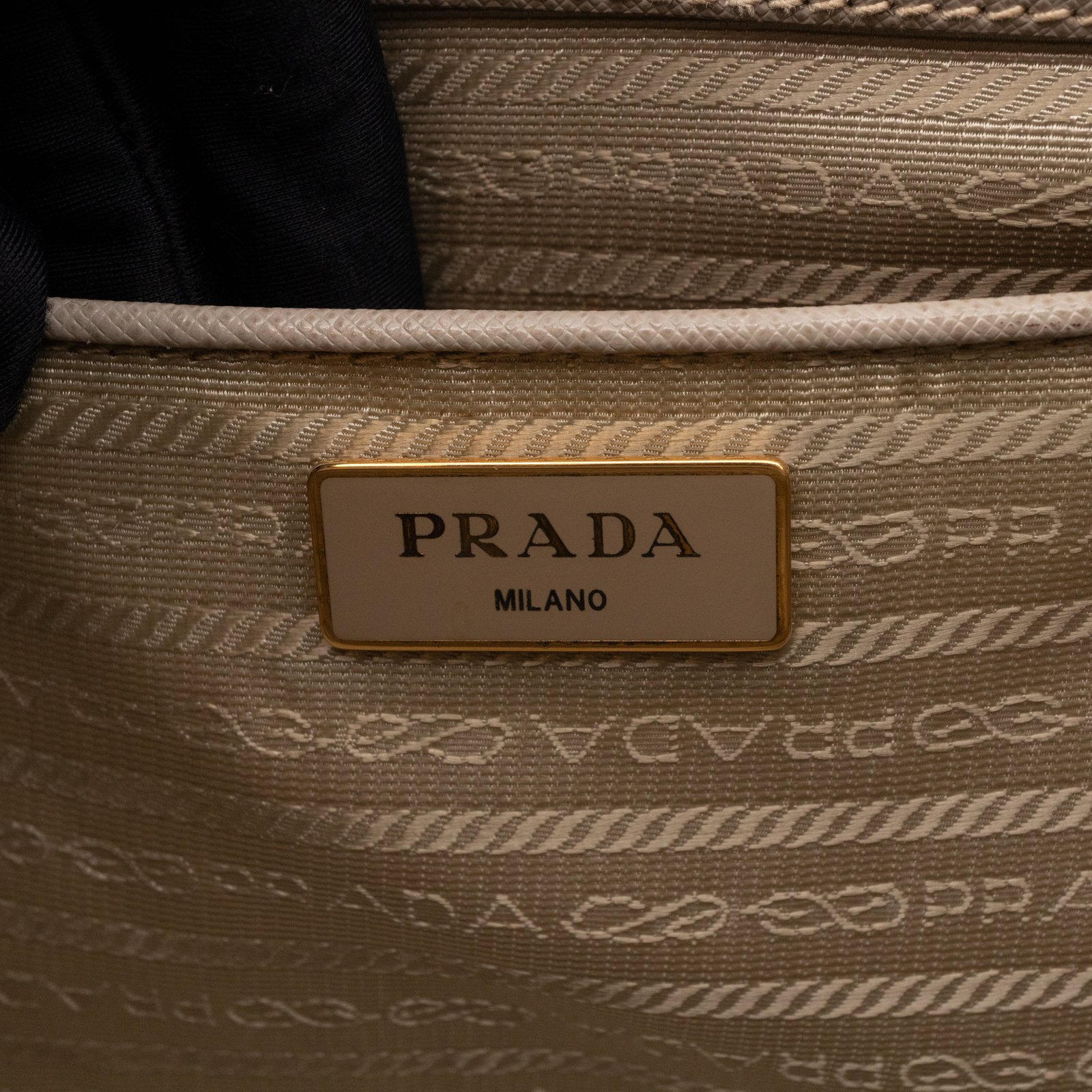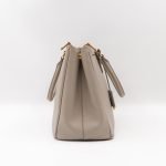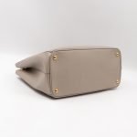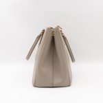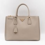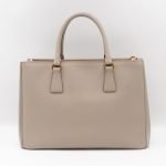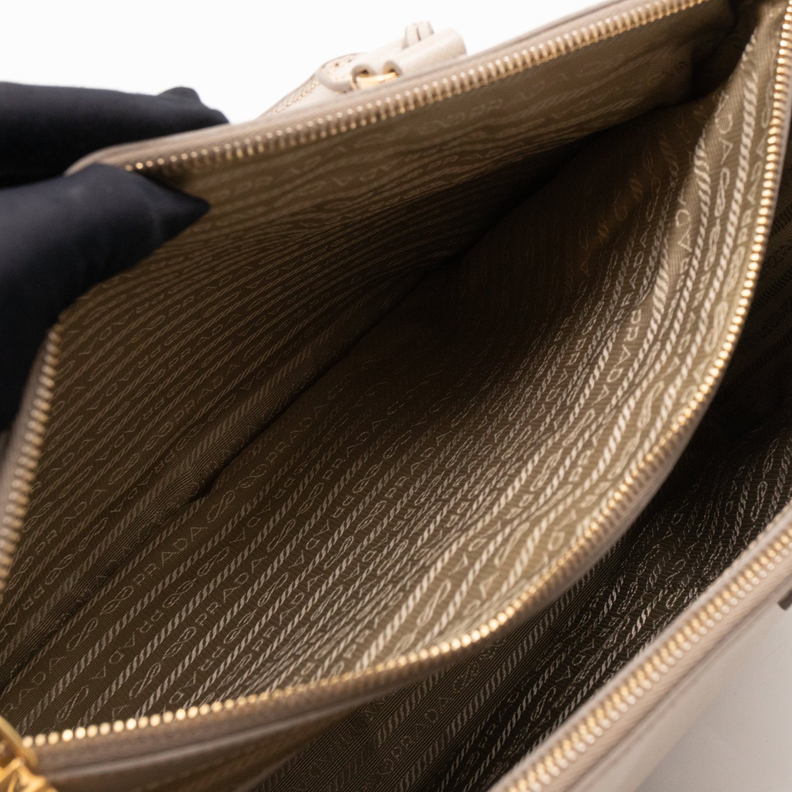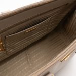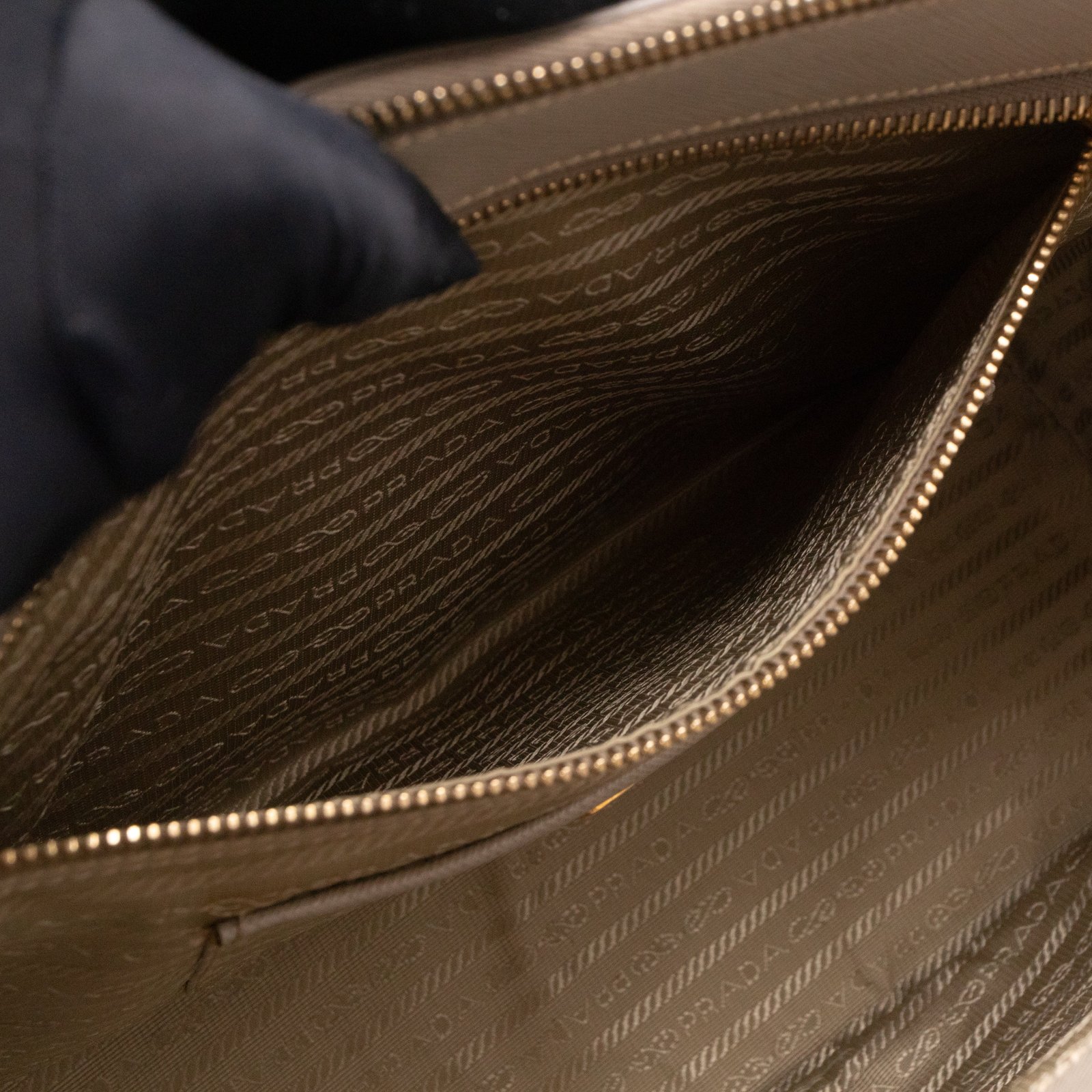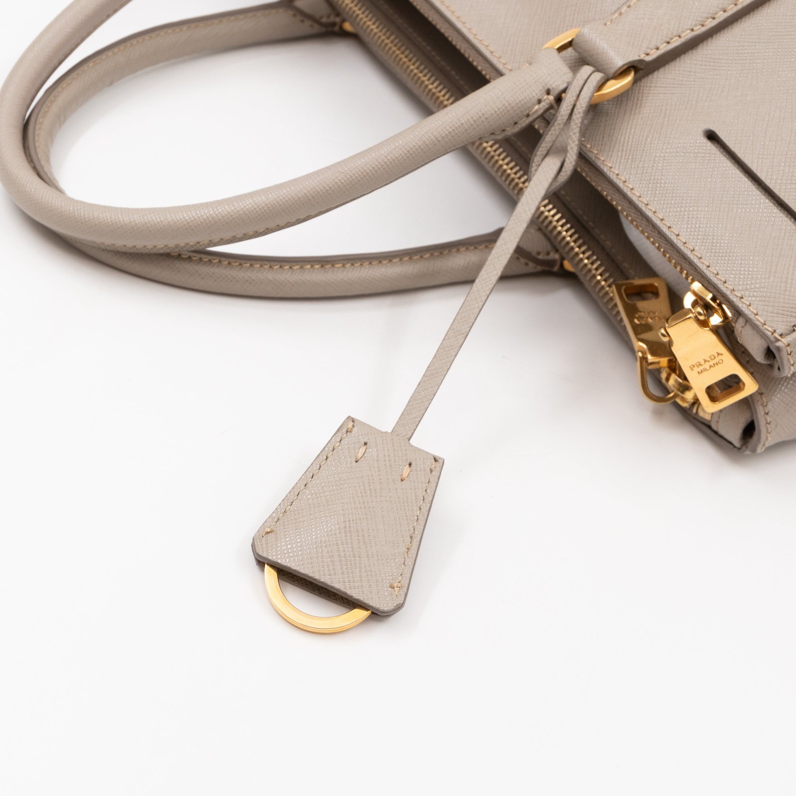 A Prada Galleria Large Double Zip bag in durable Saffiano leather. Very convenient double zipper bag in a grey taupe color, combined with gold-tone hardware. This larger size fits your ipad, wallet, documents and even a small laptop. Great choice for daily and work use. Each side has zipper pockets, the middle compartment expands to a spacious size. Current retail price €4000.