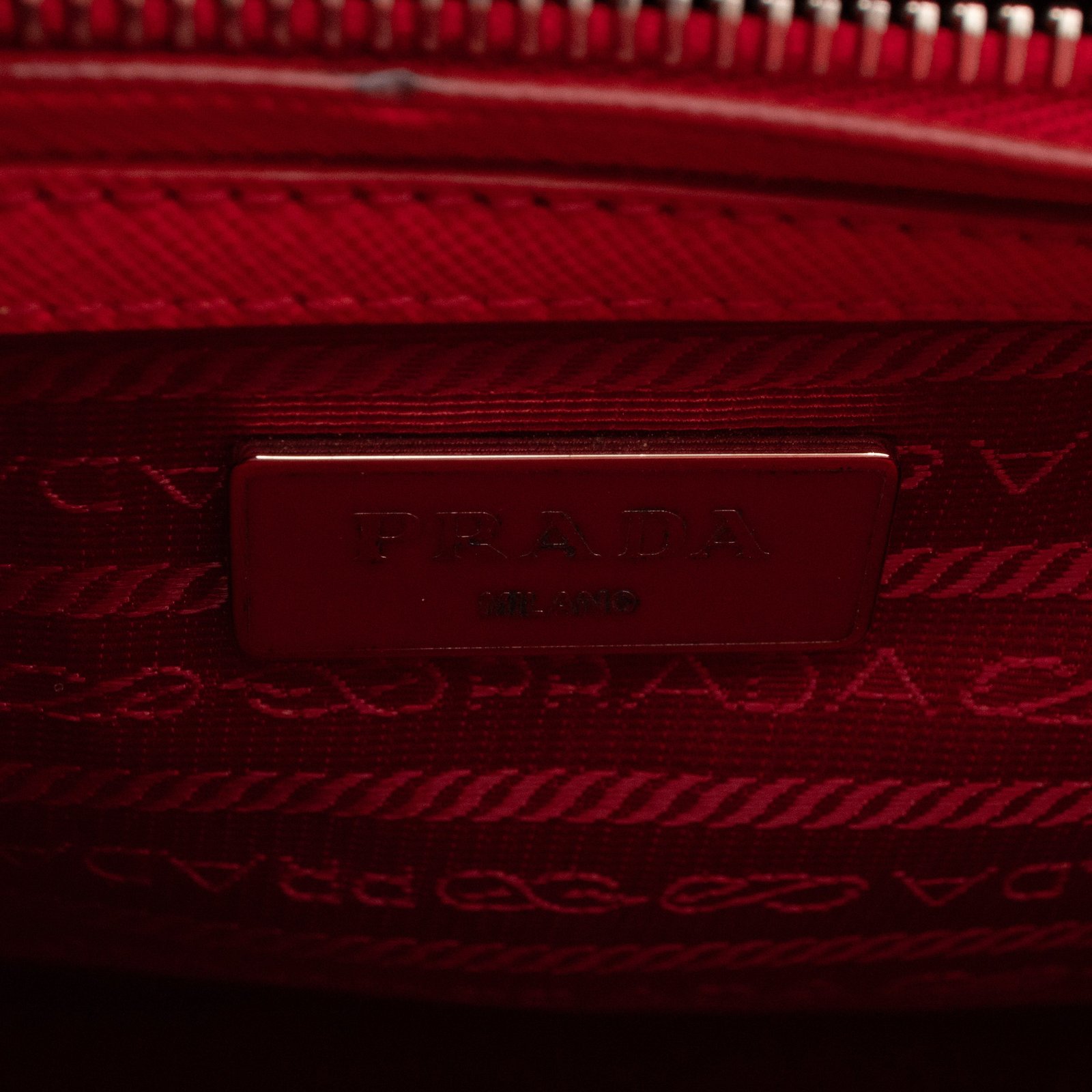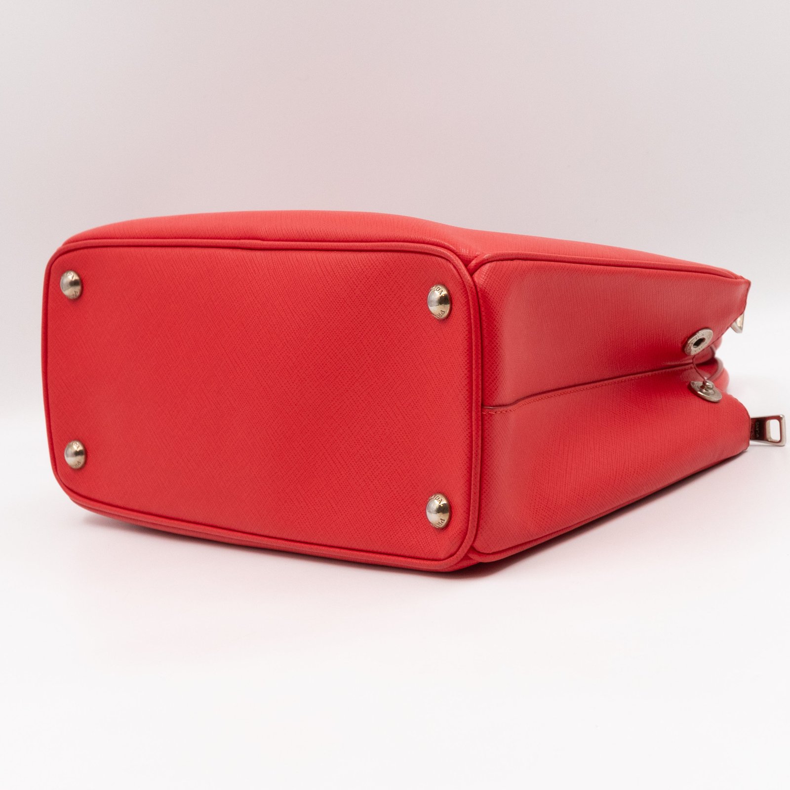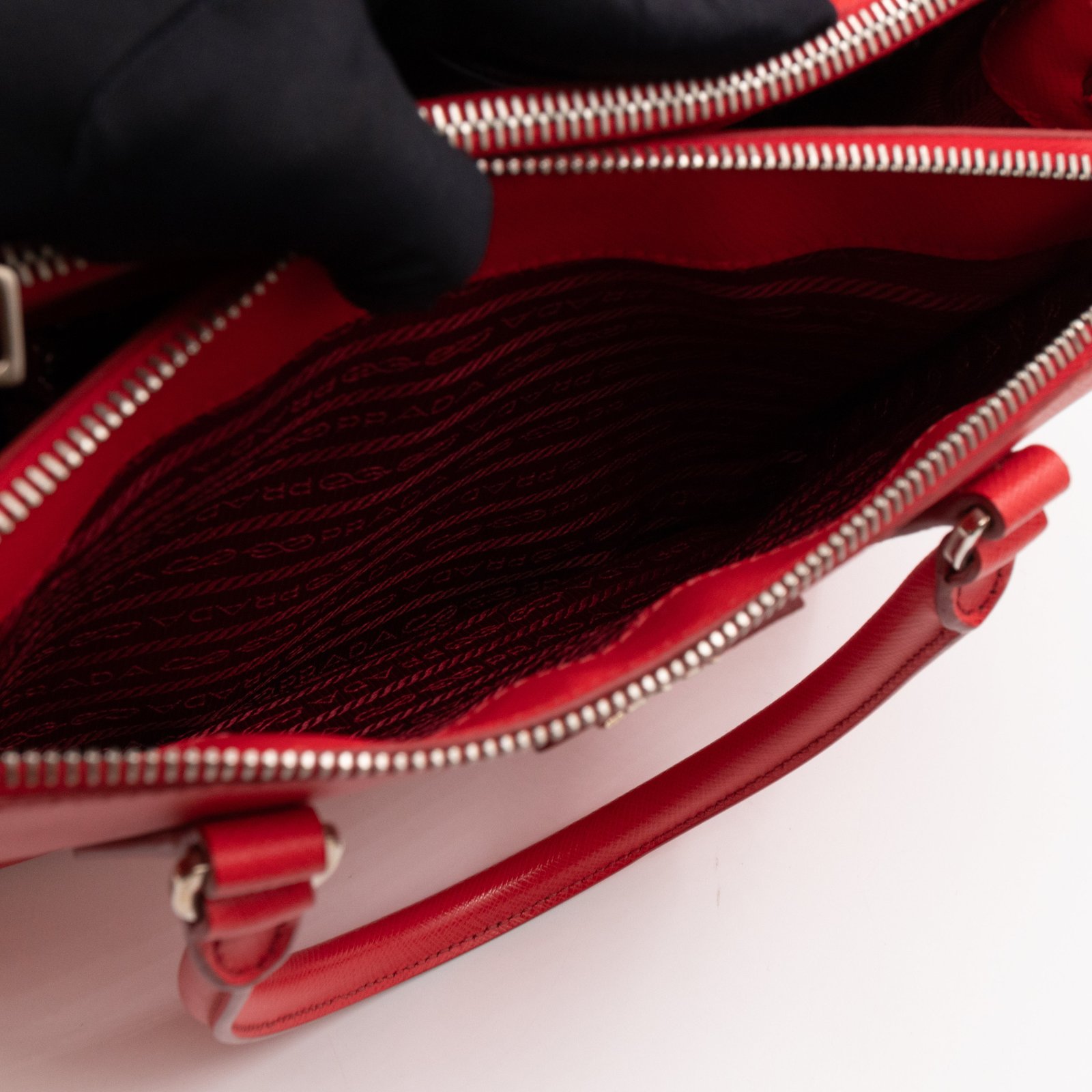 A Prada Galleria Medium Double Zip bag in durable Saffiano leather. Very convenient double zipper bag in nice lacca red color, combined with silver-tone hardware. This medium edition size fits your phone, wallet, documents and so on, even a smaller laptop or iPad fits nicely. Great choice for daily use. Each side has zipper pockets, the middle compartment expands to a spacious size. Current retail price €3700.
