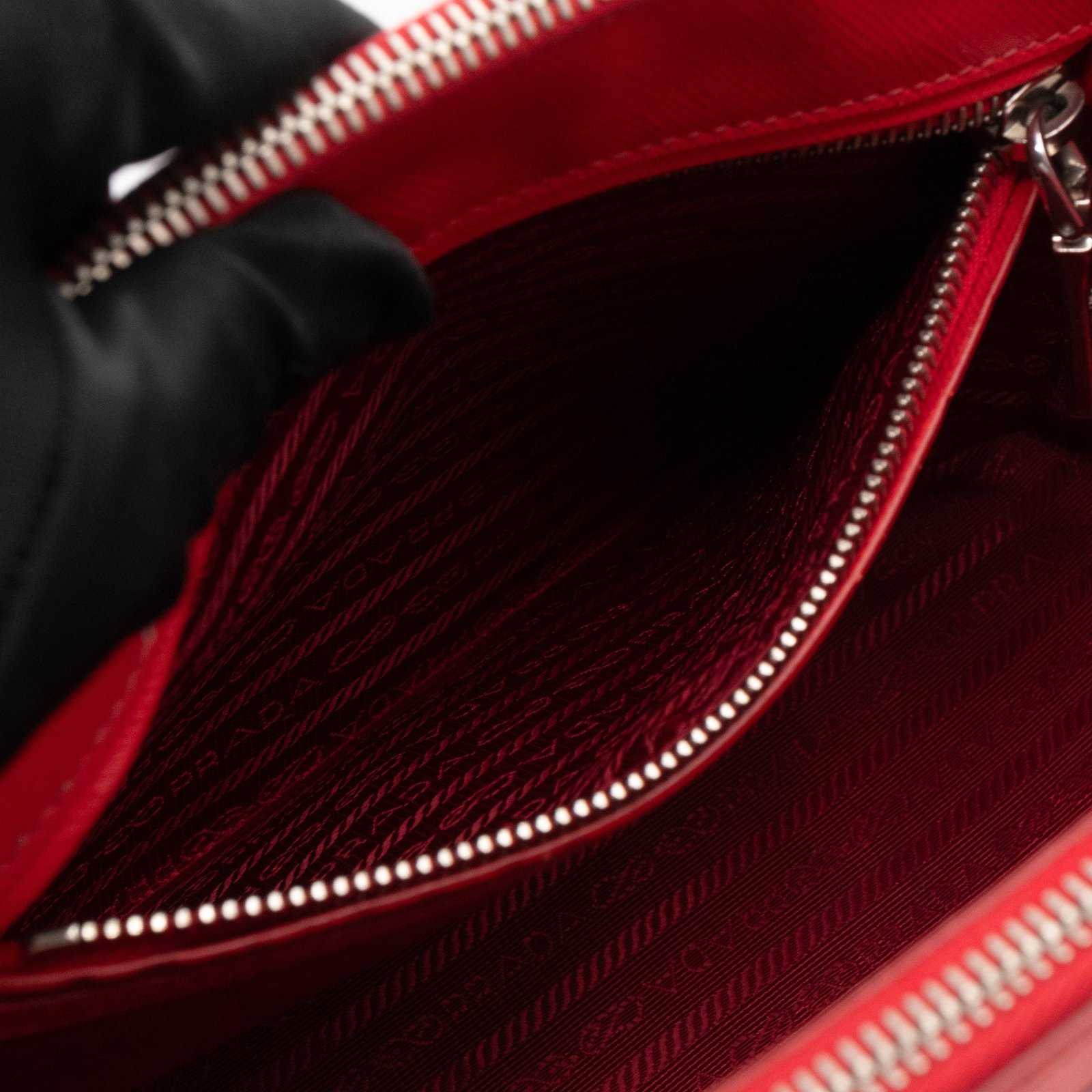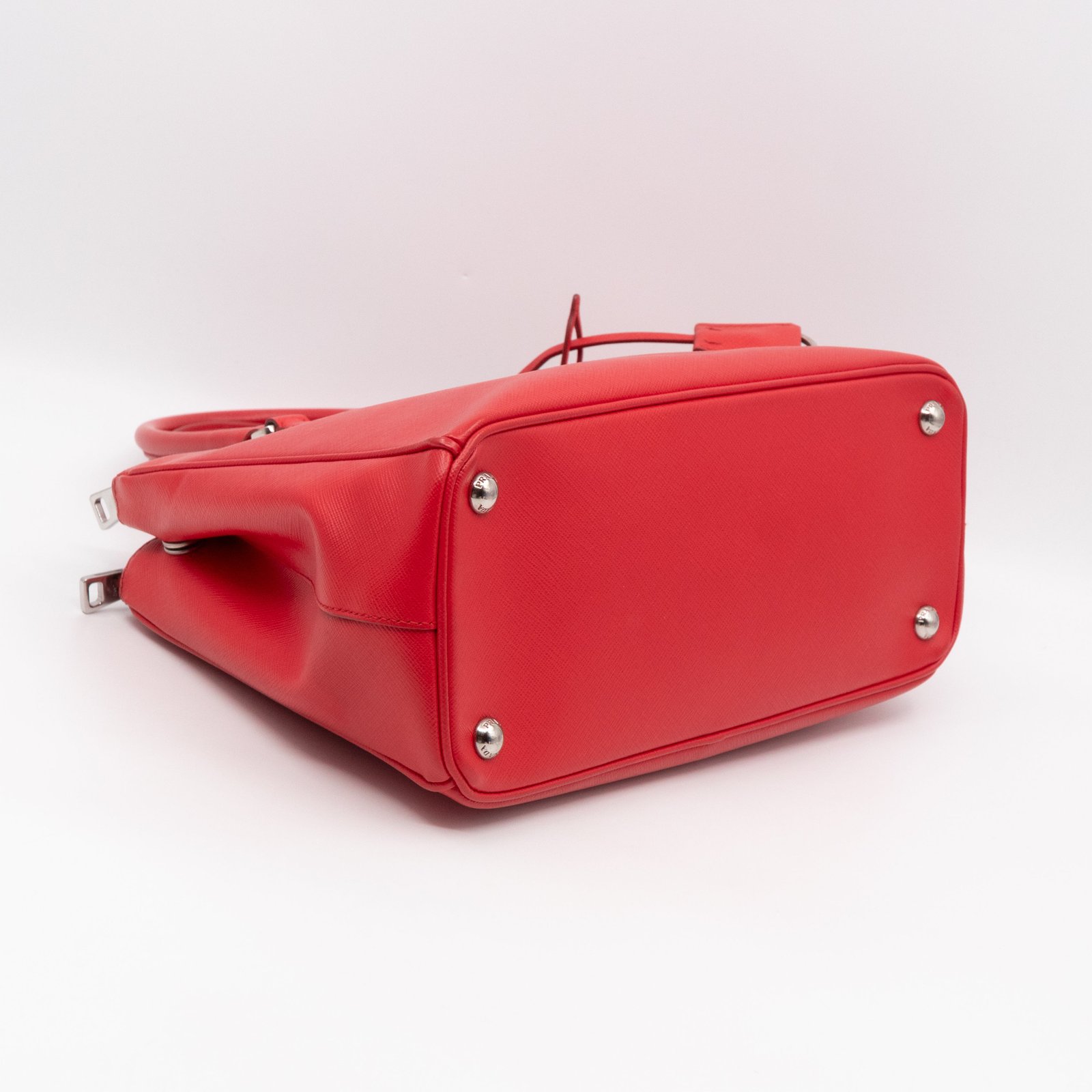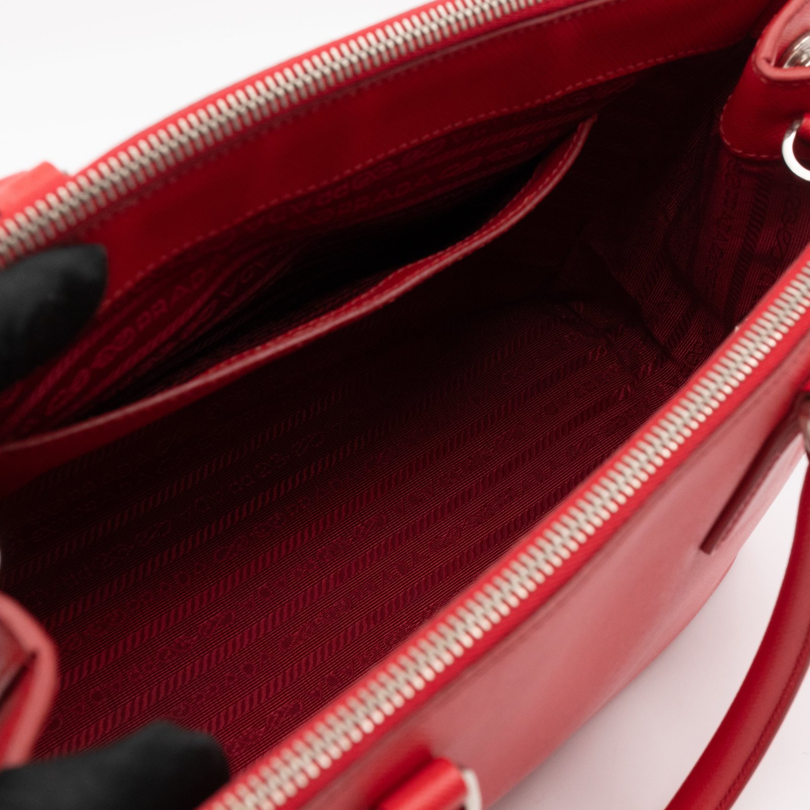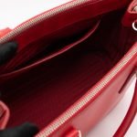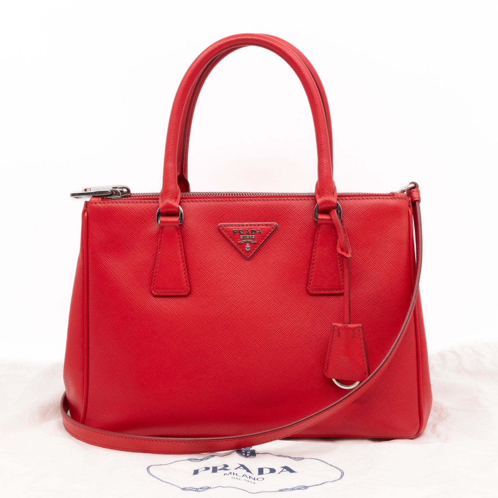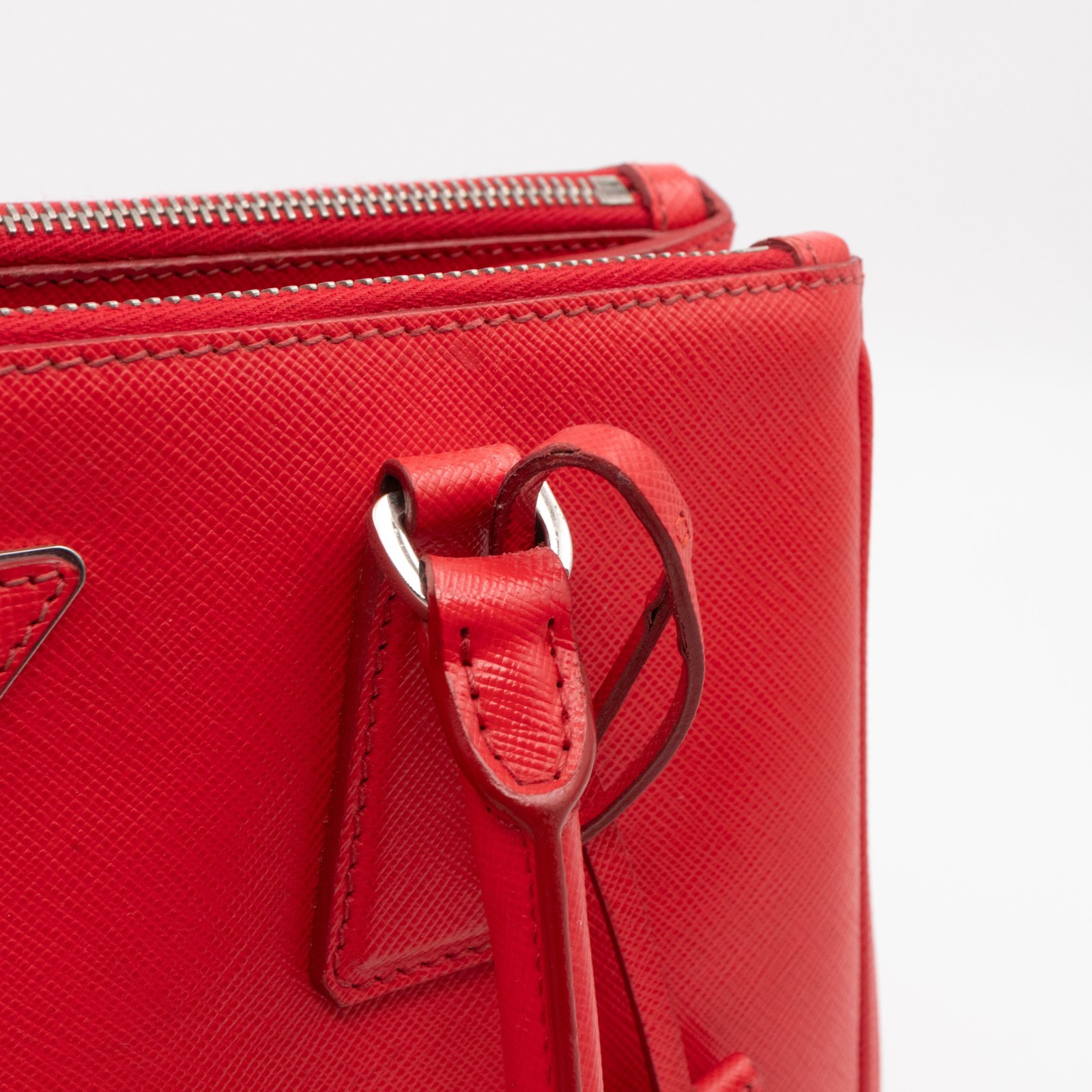 A Prada Galleria Medium Double Zip bag in durable Saffiano leather. Very convenient double zipper bag in nice red color, combined with silver-tone hardware. This medium edition size fits your phone, wallet, documents and so on, even a smaller laptop or iPad fits nicely. Great choice for daily use. Each side has zipper pockets, the middle compartment expands to a spacious size. Current retail price €3700.