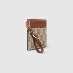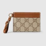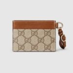 The GG Emblem collection reinterprets signature motifs through creativity and innovative functions , and is envisioned to be cherished for years to come. Introduced in the latest line of small accessories, this beige and dark brown card case is crafted from the new GG Monogram fabric. Featuring multiple compartments, it is completed by a brown leather wrist strap.