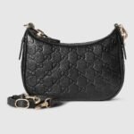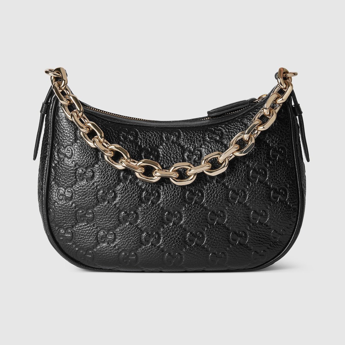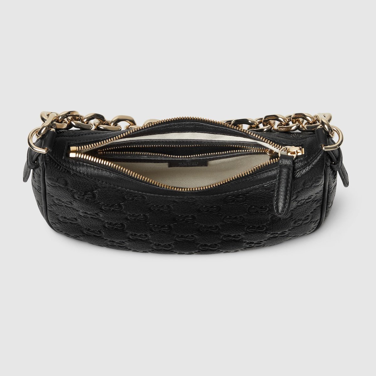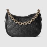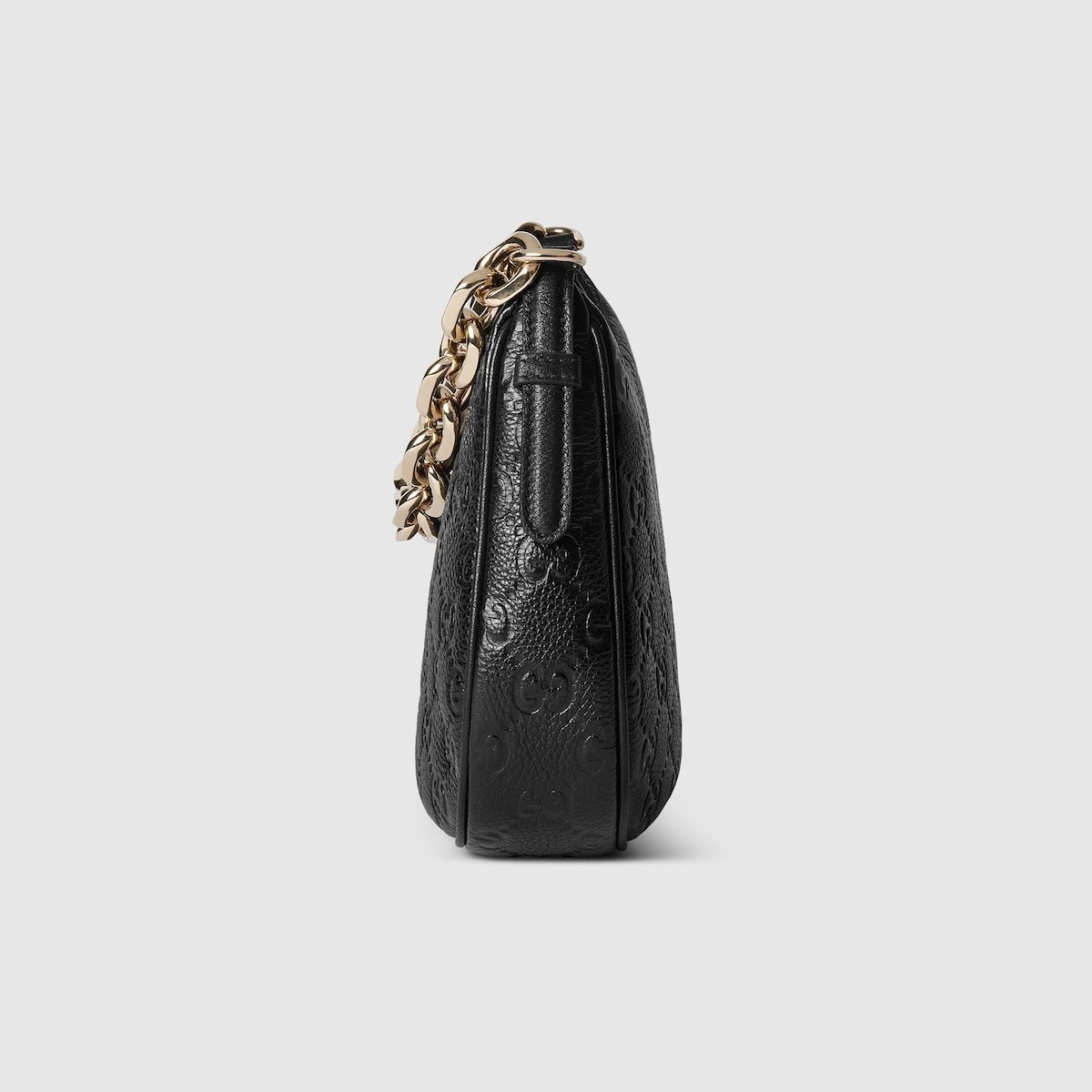 The new GG Emblem collection reinterprets the House??s history of elegance and craftsmanship. This small half moon shoulder bag features a light gold-toned chain, and comes with an additional leather shoulder strap for crossbody wear.