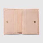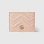 The GG Marmont card case wallet is crafted from matelass?? leather in a delicate shade of light pink. This signature piece of small leather goods is defined by the line’s emblematic Double G hardware, an archival symbol from the 1970s that has become a hallmark of the House.