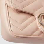 The GG Marmont super mini bag is crafted from matelass?? chevron leather in a delicate light pink shade for the Cruise 2025 collection. The shape is defined by the line’s emblematic Double G hardware, an archival symbol from the 1970s that has become a hallmark of the House.