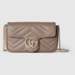 Embellished with the archival Double G logo, first introduced in the 1970s, the GG Marmont line has established itself as a signature style of the House. The two capital letters refer to the historic emblem, recognizable by the partially overlapping hardware on this bag front. Crafted from taupe matelass?? leather, the elegant small accessory is evocative of Florentine craftsmanship.