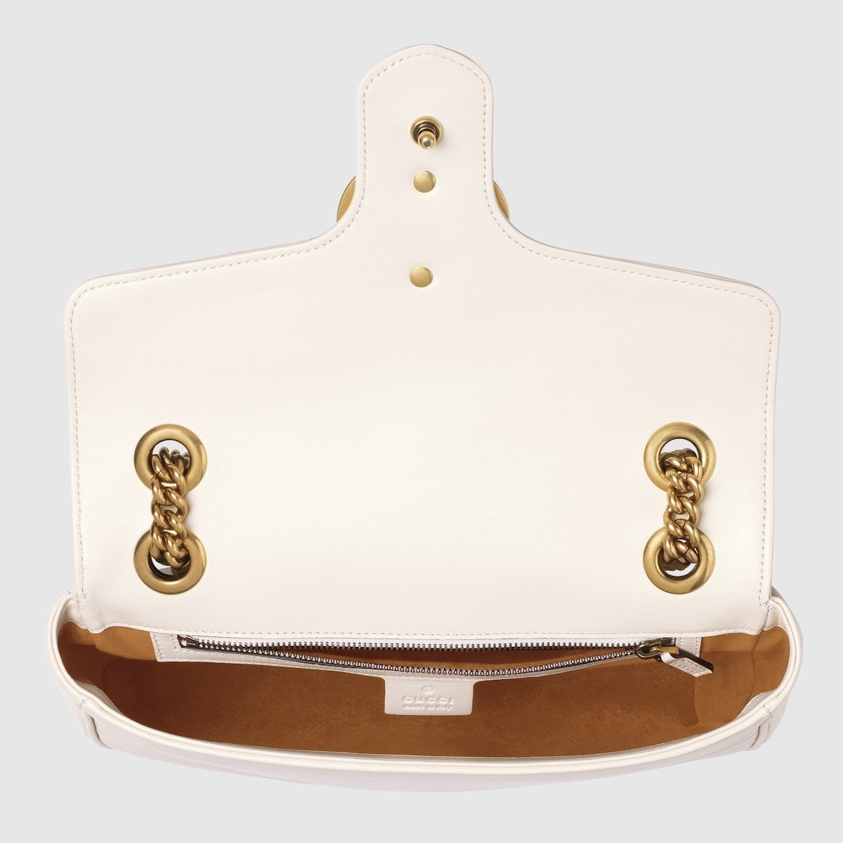 The small GG Marmont chain shoulder bag has a softly structured shape and an oversized flap closure with Double G hardware. The sliding chain strap can be worn multiple ways, changing between a shoulder and a top handle bag. Made in matelass?? chevron leather with a heart on the back.
