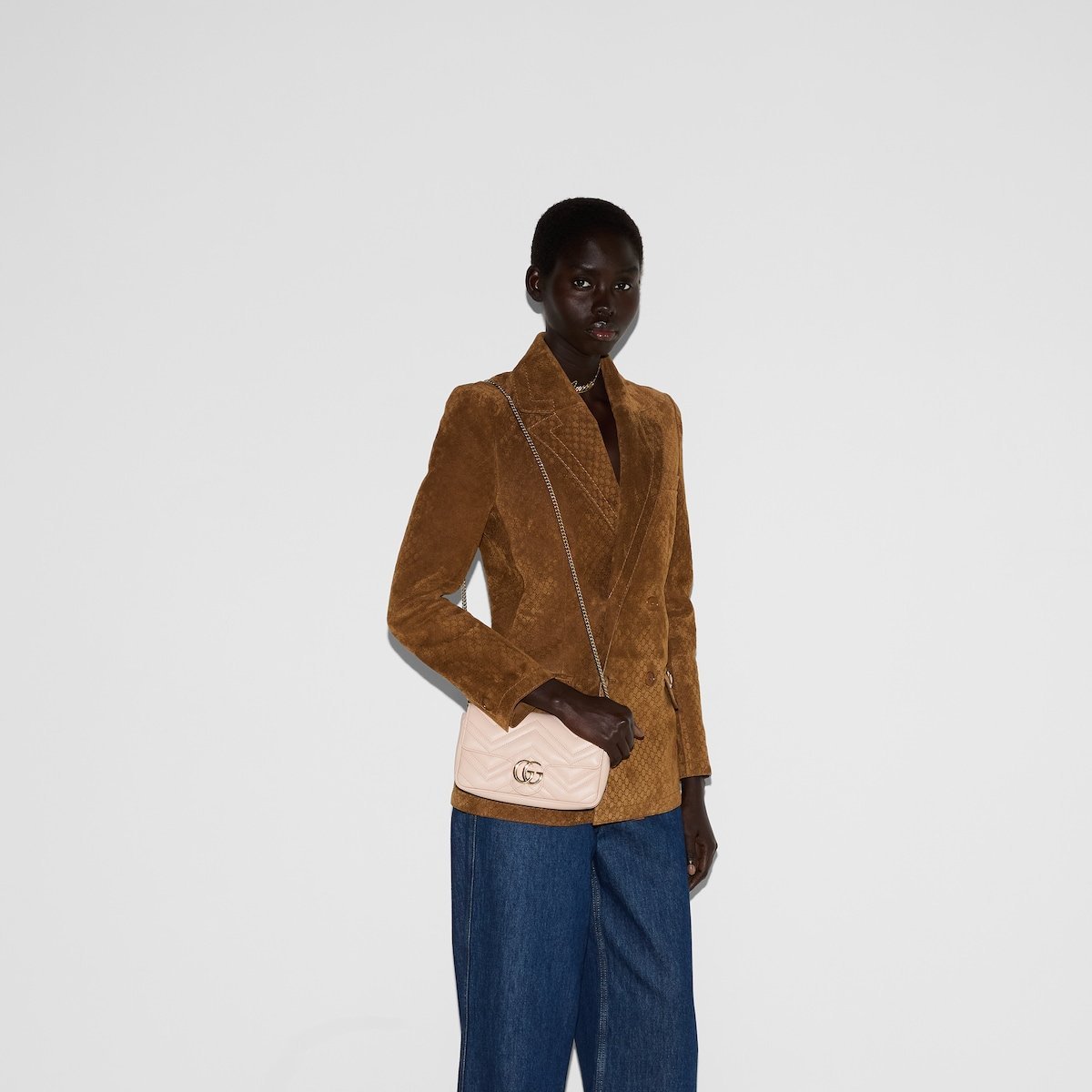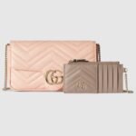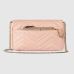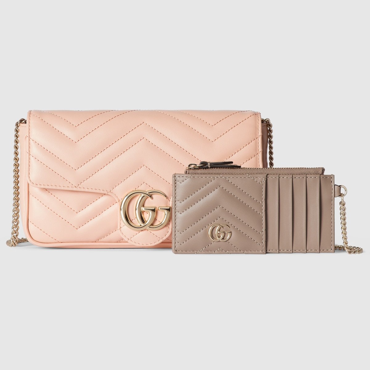 This GG Marmont mini bag is crafted from a light pink chevron leather. The signature Double G hardware defines the accessory, while a detachable leather card case completes the style.