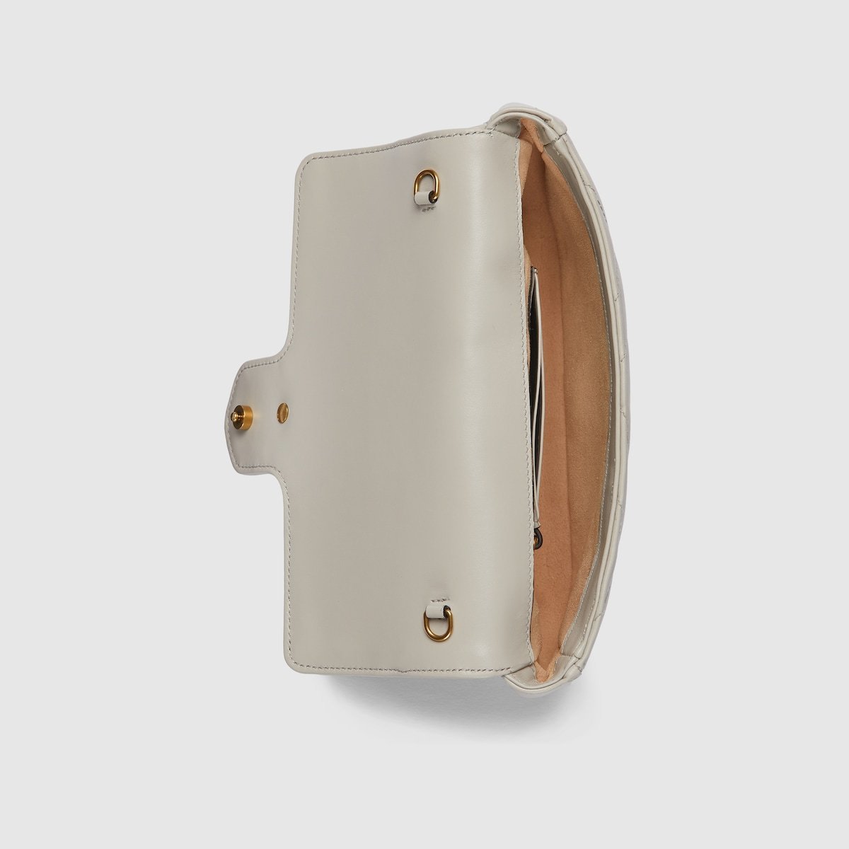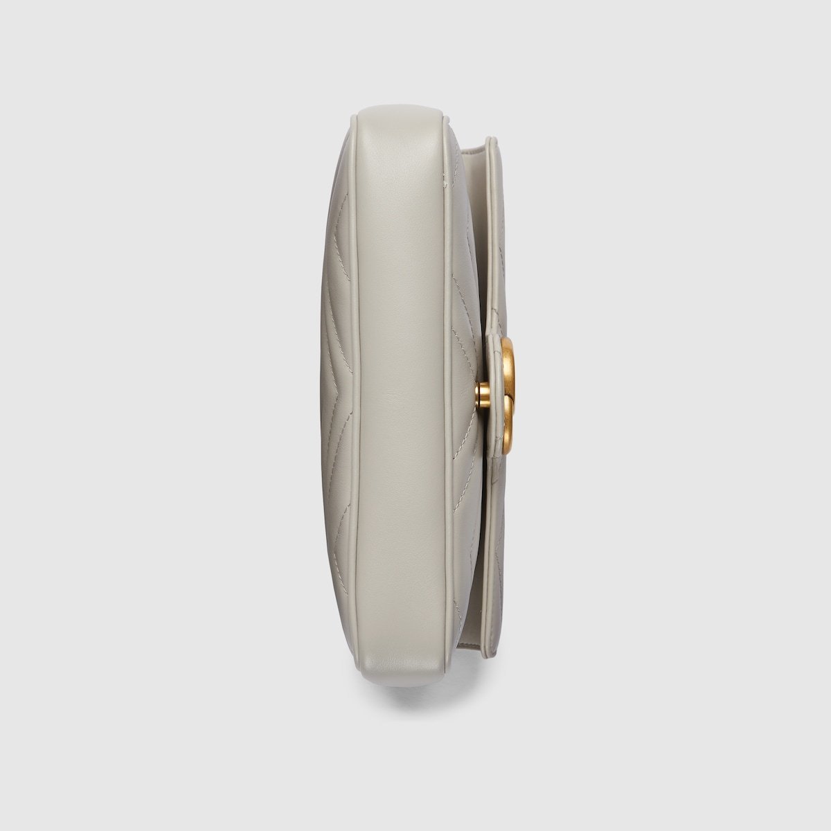 This GG Marmont mini bag is crafted from a light grey matelass?? chevron leather. The signature Double G hardware in antique gold-toned defines the accessory, while a detachable leather card case completes the style.