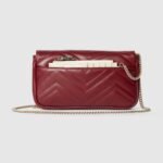 This GG Marmont mini bag is crafted from the new Gucci Rosso Ancora red matelass?? chevron leather. The signature Double G hardware in a lighter gold-toned defines the accessory, while a detachable leather card case completes the style in contrasting white leather.