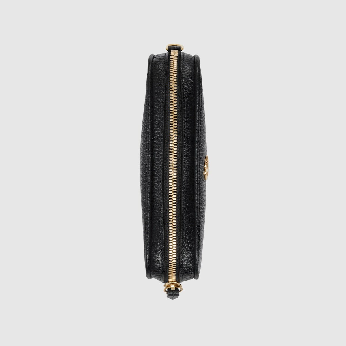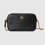 The GG Marmont collection is defined by the emblematic Double G gold-toned hardware, a contemporary take on a Gucci archival motif. This black leather super mini bag with a chain strap and zip closure reveals two card slots inside for effortless organization.