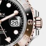 This model features a black dial and a two-colour Cerachrom bezel insert in brown and black ceramic. Designed to show the time in two different time zones simultaneously during intercontinental flights, the GMT-Master II has come to be recognized for its robustness and versatile appearance.