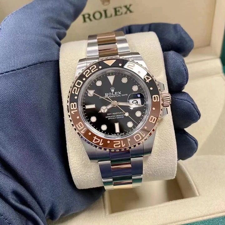 This model features a black dial and a two-colour Cerachrom bezel insert in brown and black ceramic. Designed to show the time in two different time zones simultaneously during intercontinental flights, the GMT-Master II has come to be recognized for its robustness and versatile appearance.