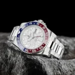 This model features a meteorite dial and a two-colour Cerachrom bezel insert in red and blue ceramic. Designed to show the time in two different time zones simultaneously during intercontinental flights, the GMT-Master II has come to be recognized for its robustness and versatile appearance.