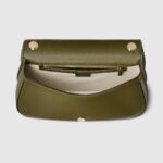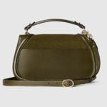 The new Gucci Blondie bag, whose distinctive logo first appeared in the House??s collections in the early 1970s, weaves together past and present in a fusion of nostalgia and modernity. This medium top handle bag is crafted from dark green suede, featuring the House’s round symbol in enamel. The style is complete with a leather top handle and detachable, adjustable shoulder strap.
