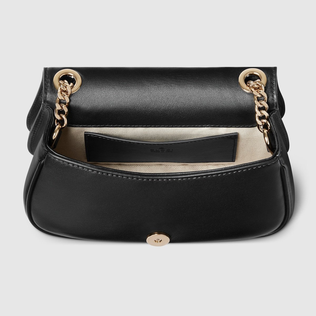 The new Gucci Blondie bag, whose distinctive logo first appeared in the House??s collections in the early 1970s, weaves together past and present in a fusion of nostalgia and modernity. This mini shoulder bag with a gold-toned chain is crafted from black leather, featuring the House’s round symbol in enamel.
