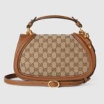 The new Gucci Blondie bag, whose distinctive logo first appeared in the House??s collections in the early 1970s, weaves together past and present in a fusion of nostalgia and modernity. Presented in beige and ebony GG canvas with a smooth brown leather trim, this small bag is complete with a top handle and adjustable shoulder strap.