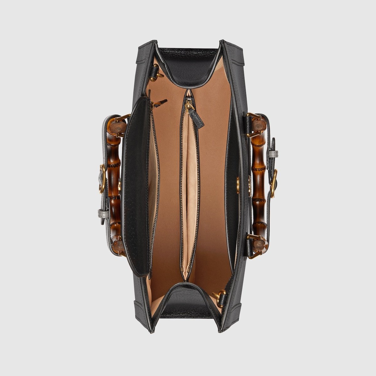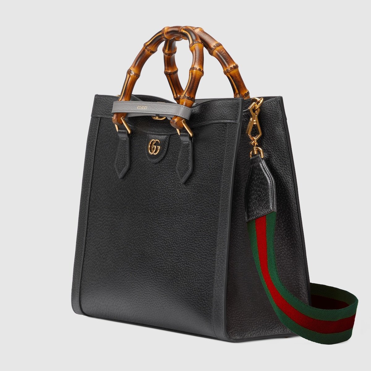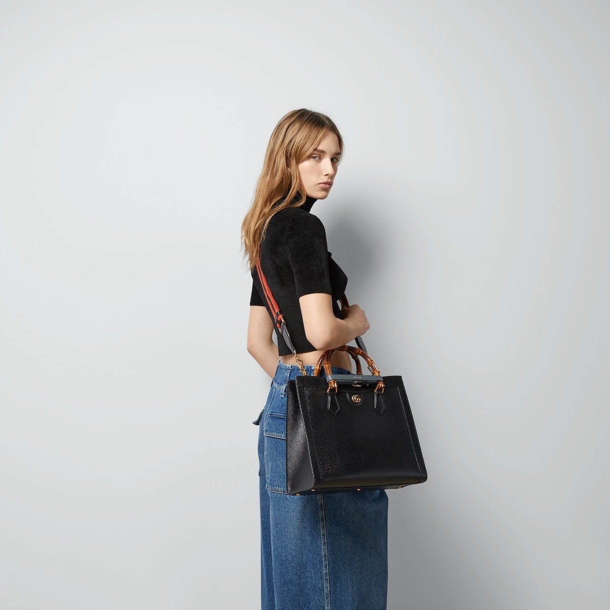 First used in the post-war era when traditional materials were hard to come by, bamboo has become not only a symbol of the spirit of reinvention that runs throughout the House’s designs but one of Gucci’s most recognizable signatures. The Gucci Diana embodies this idea, representing the notion of style in constant evolution with its removable leather belts??a nod to the functional bands used to keep the handles in shape. Here, the bag is presented in black leather.