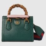 An evolution of a bamboo handle tote first introduced in 1991, the Gucci Diana represents the notion of style in constant evolution and is reimagined with removable, neon leather belts??a nod to the functional bands used to keep the handles in shape. Here, a mini version of the emblematic style is presented in green leather.