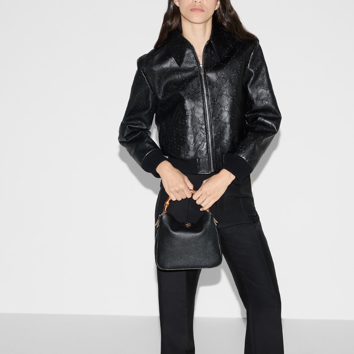 Combining recognizable elements of the House, the Gucci Diana is defined by its bamboo handles and Double G hardware. Crafted from black leather, the accessory is further accentuated by a contrasting grey leather shoulder strap.