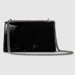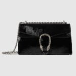 A soft, deconstructed version of the signature Dionysus shoulder bag presents a contemporary look. This style in sleek black patent leather features the iconic tiger head closure with a flap and a sliding chain that can be worn both as a shoulder bag and a top handle bag, giving it many possibilities to wear.