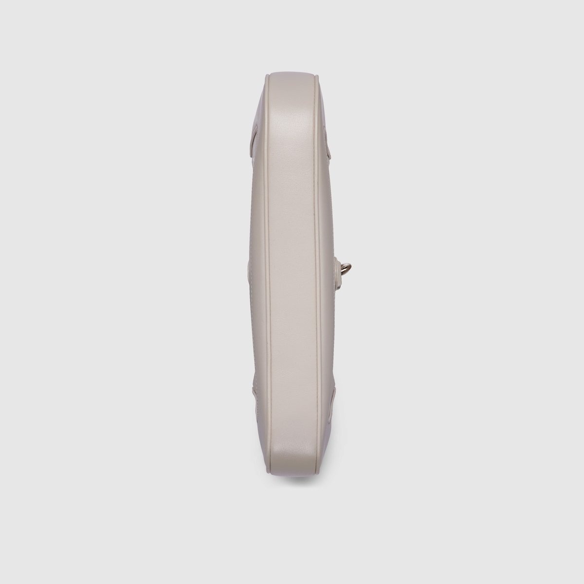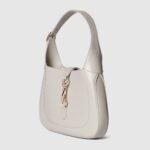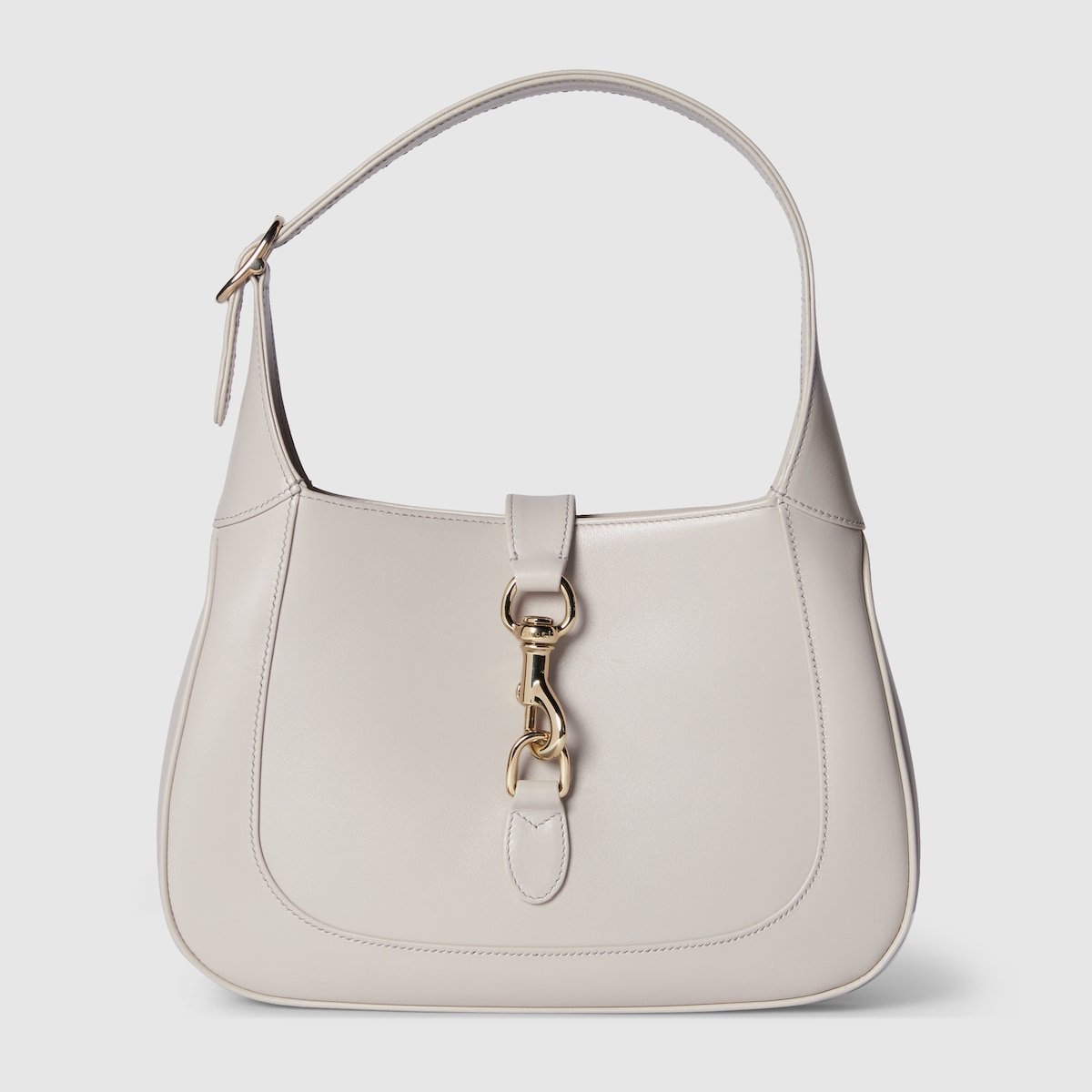 The new Gucci Jackie is crafted from premium fine leather which highlights the craftsmanship, crescent shape, and sleek silhouette of the House’s emblematic shoulder bag. Light gold-toned hook closure, leather trim, and an additional Web strap gives this Gucci Jackie small shoulder bag in light grey leather further styling options.