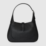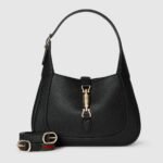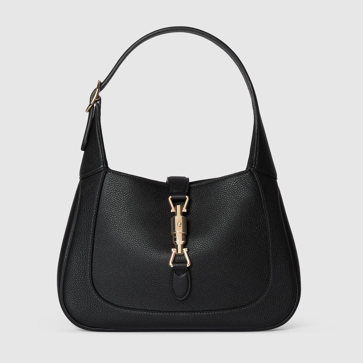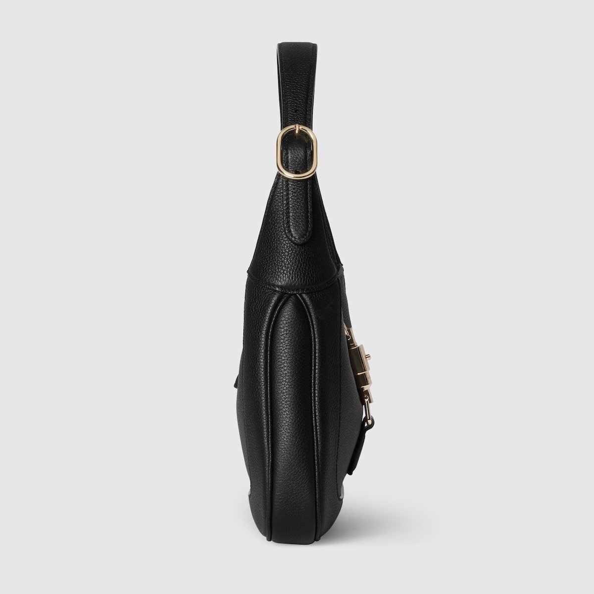 In the Fall Winter 2024 collection, the Gucci Jackie 1961 shoulder bag with new light gold-toned piston closure features fine black leather, highlighting its craftsmanship, crescent shape, and sleek silhouette. This small size comes with a leather strap and additional green and red Web strap for different styling possibilities.