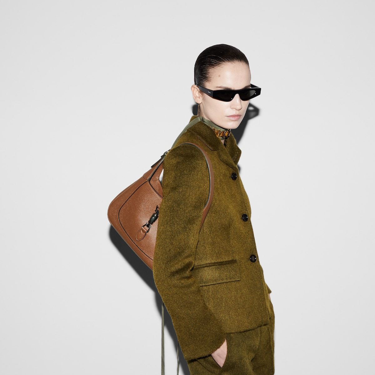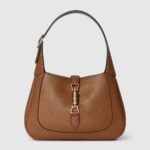 In the Fall Winter 2024 collection, the Gucci Jackie 1961 shoulder bag with new light gold-toned piston closure features fine cuir leather, highlighting the craftsmanship, crescent shape, and sleek silhouette of the House’s iconic handbag. This small size comes with a leather strap and additional green and red Web strap for different styling possibilities.