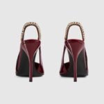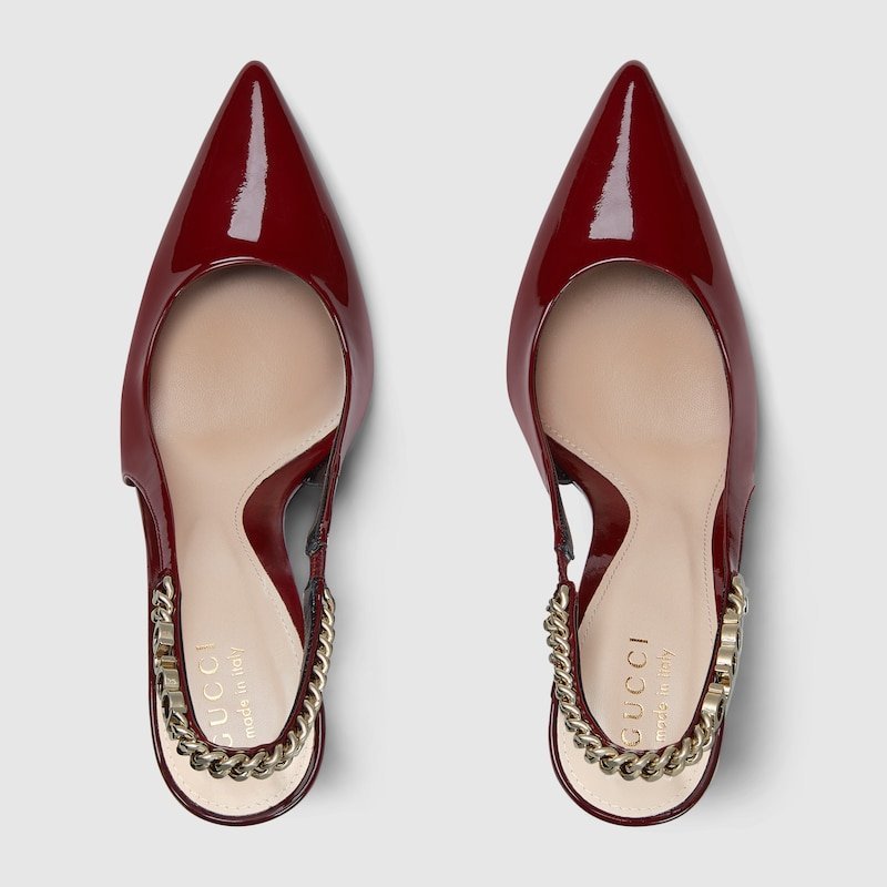 The Gucci Signoria pump, named after the central piazza of Florence, recalls the classic elegance of the House??s founding city. With its shiny patent leather, pointed toe and eye-catching Gucci chain, this slingback style elevates the everyday wardrobe for the coming season.