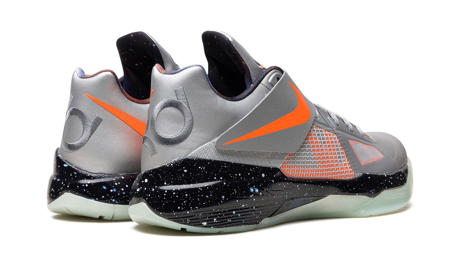 The Nike KD 4 “Galaxy” is the modern re-release of Kevin Durant’s fourth signature shoe with Nike Basketball in a colorway that debuted in 2012 for the NBA All-Star Game in Orlando, Florida. The original Nike KD 4 “Galaxy” was released as part of a collection of space-themed sneakers that included the Nike Zoom Kobe 7, Nike LeBron 9, and the Nike Air Foamposite One “Galaxy,” one of the most desirable sneakers in history. Here, the modern reissue of the Nike KD 4 “Galaxy” stays true to its original design, with a Metallic Silver, Total Orange, and Dark Grey color scheme that draws inspiration from the design of astronaut suits. A NASA-inspired mission patch is found on the tongues and “KD” branding is embroidered on the heel. A black, star-speckled midsole and glow-in-the-dark outsole complete the classic All-Star sneaker. Release date: February 16, 2024