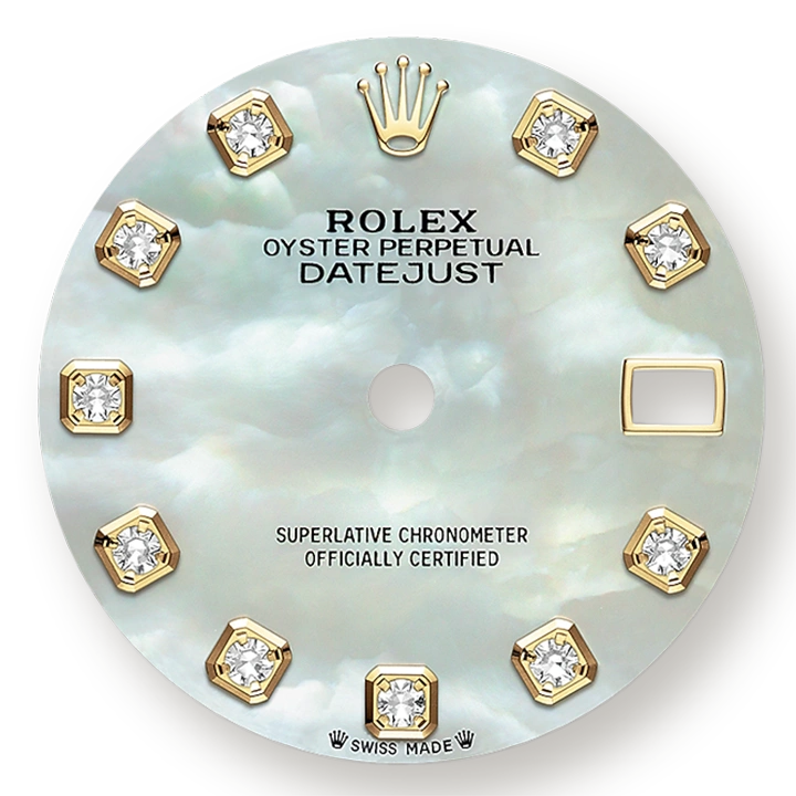The light reflections on the case sides and lugs highlight the elegant profile of the 28 mm Oyster case, which is fitted with a diamond-set bezel. Rolex’s classic feminine watch, the Lady-Datejust is in the lineage of the Datejust, the emblematic model that has been a byword for style and accurate timekeeping.