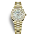 THIS OYSTER PERPETUAL LADY-DATEJUST IN 18 CT YELLOW GOLD FEATURES A WHITE MOTHER-OF-PEARL, DIAMOND-SET DIAL AND A PRESIDENT BRACELET.