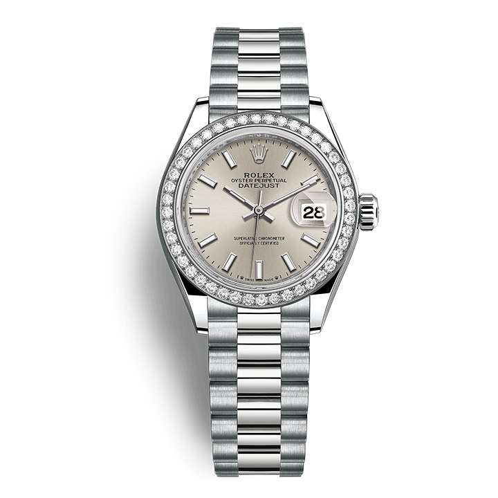 The light reflections on the case sides and lugs highlight the elegant profile of the 28 mm Oyster case, which is fitted with a diamond-set bezel. Rolex’s classic feminine watch, the Lady-Datejust is in the lineage of the Datejust, the emblematic model that has been a byword for style and accurate timekeeping.