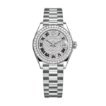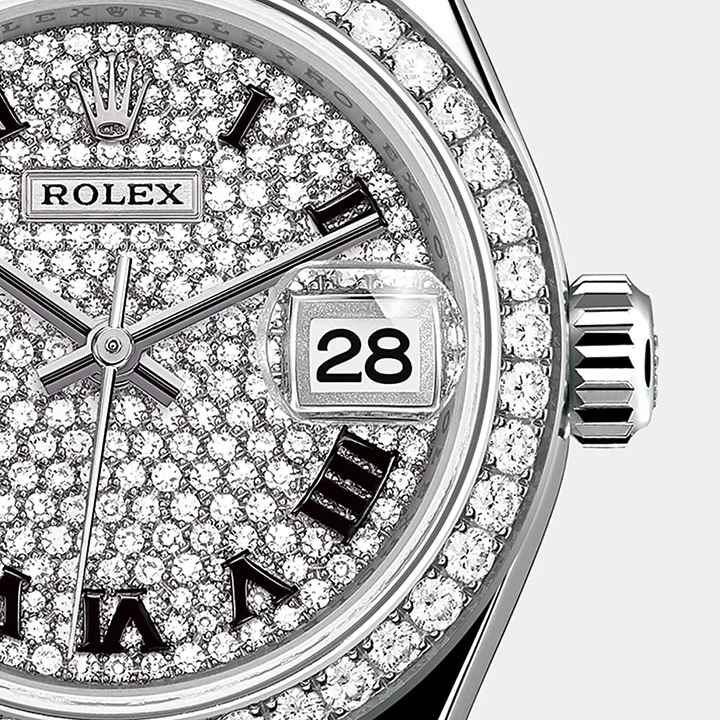 The light reflections on the case sides and lugs highlight the elegant profile of the 28 mm Oyster case, which is fitted with a diamond-set bezel. Rolex’s classic feminine watch, the Lady-Datejust is in the lineage of the Datejust, the emblematic model that has been a byword for style and accurate timekeeping.